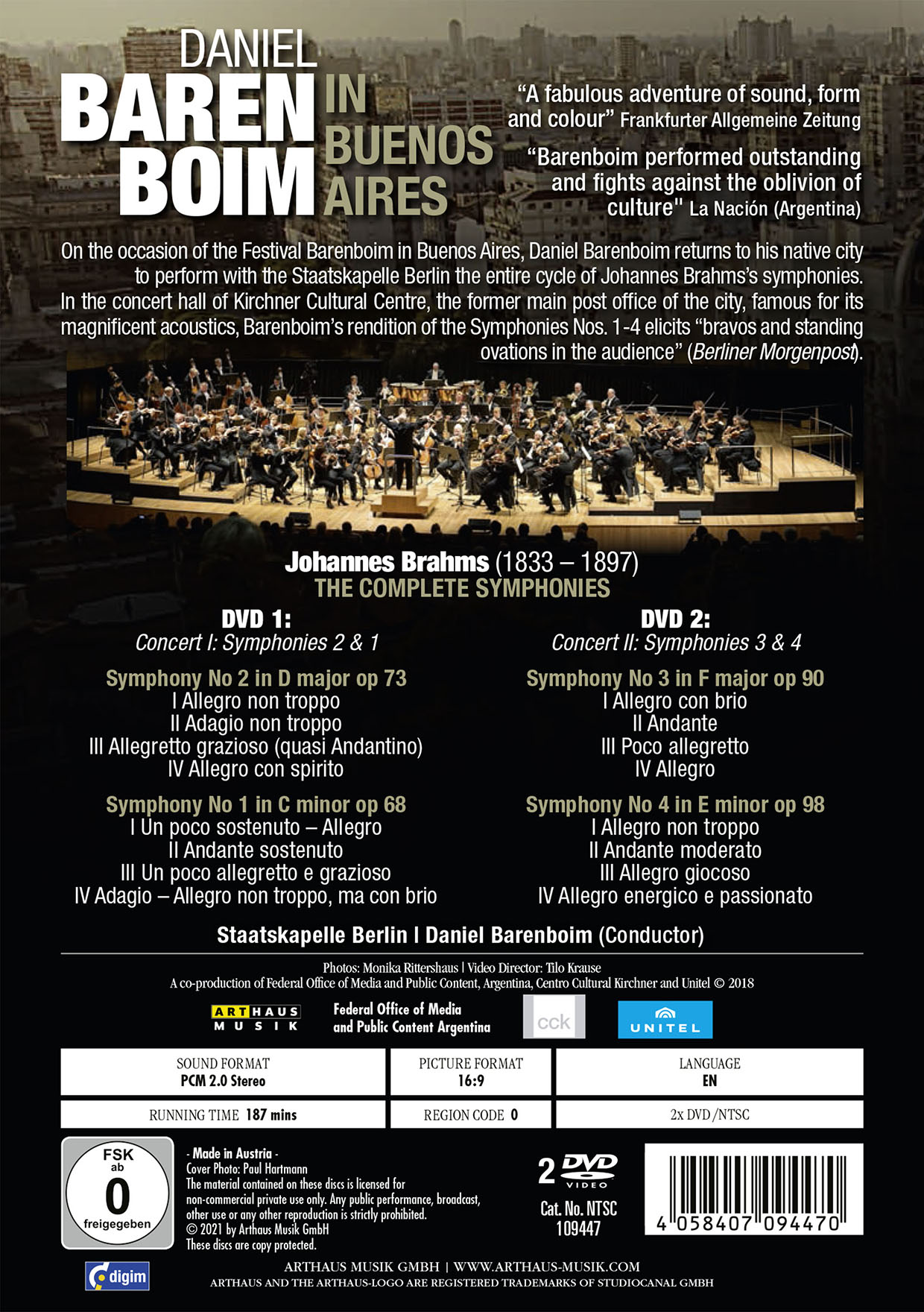 Anlässlich des Barenboim Festivals in Buenos Aires kehrt Daniel Barenboim in seine Heimatstadt zurück, um mit der Staatskapelle Berlin den gesamten Zyklus der Brahms-Sinfonien aufzuführen. Im Konzertsaal des Kirchner Kulturzentrums, welches für seine hervorragende Akustik berühmt ist, erklingt Barenboims Interpretation der Sinfonien Nr. 1-4 und ruft „Bravos und Standing Ovations im Publikum“ hervor (Berliner Morgenpost). On the occasion of the Festival Barenboim in Buenos Aires, Daniel Barenboim returns to his native city to perform with the Staatskapelle Berlin the entire cycle of Brahms’ symphonies. In the concert hall of Kirchner Cultural Centre famous for its magnifi cent acoustics, Barenboim’s rendition of the Symphonies Nos. 1-4 elicits “bravos and standing ovations in the audience” (Berliner Morgenpost).