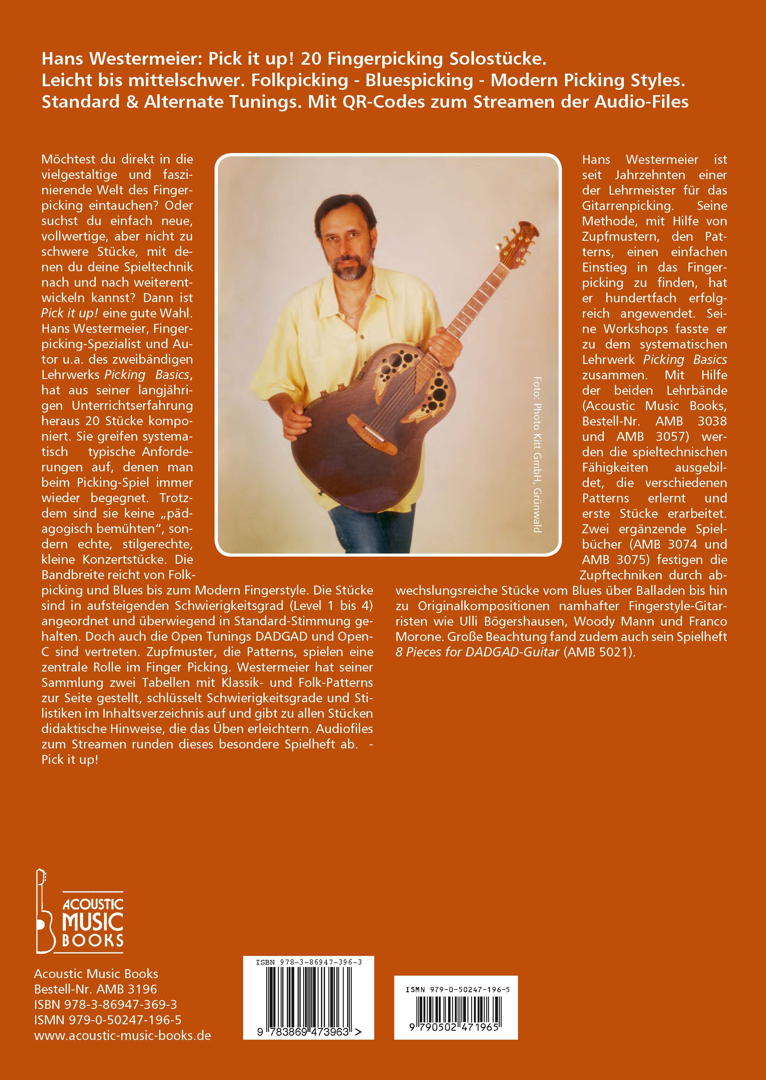 Fingerpicking-Spezialist Hans Westermeier hat für seine neuen Notenausgabe "Pick it up!" 20 stilgerechte Fingerpicking Stücke komponiert, die wunderbar klingen und darüber hinaus noch die Spielfertigkeiten der Gitarristen erweitern. Die Bandbreite reicht von Folkpicking und Blues bis zum Modern Fingerstyle. Sie sind in aufsteigendem Schwierigkeitsgrad (Level 1 bis 4) angeordnet und greifen systematisch typische Anforderungen auf, denen man beim Picking-Spiel immer wieder begegnet. Die meisten sind Standard-Stimmung gehalten. Doch auch die Open Tunings DADGAD und Open-C sind vertreten. Verbindendes Element sind die Patterns (Zupfmuster), die den Charakter der Stücke prägen. Hans Westermeier, Autor u.a. des zweibändigen Lehrwerks Picking Basics, hat auf seinen umfassenden Erfahrungsschatz zurückgegriffen und ein Fingerstyle-Spielbuch der Extraklasse kreiert. - Noten und Tabulaturen