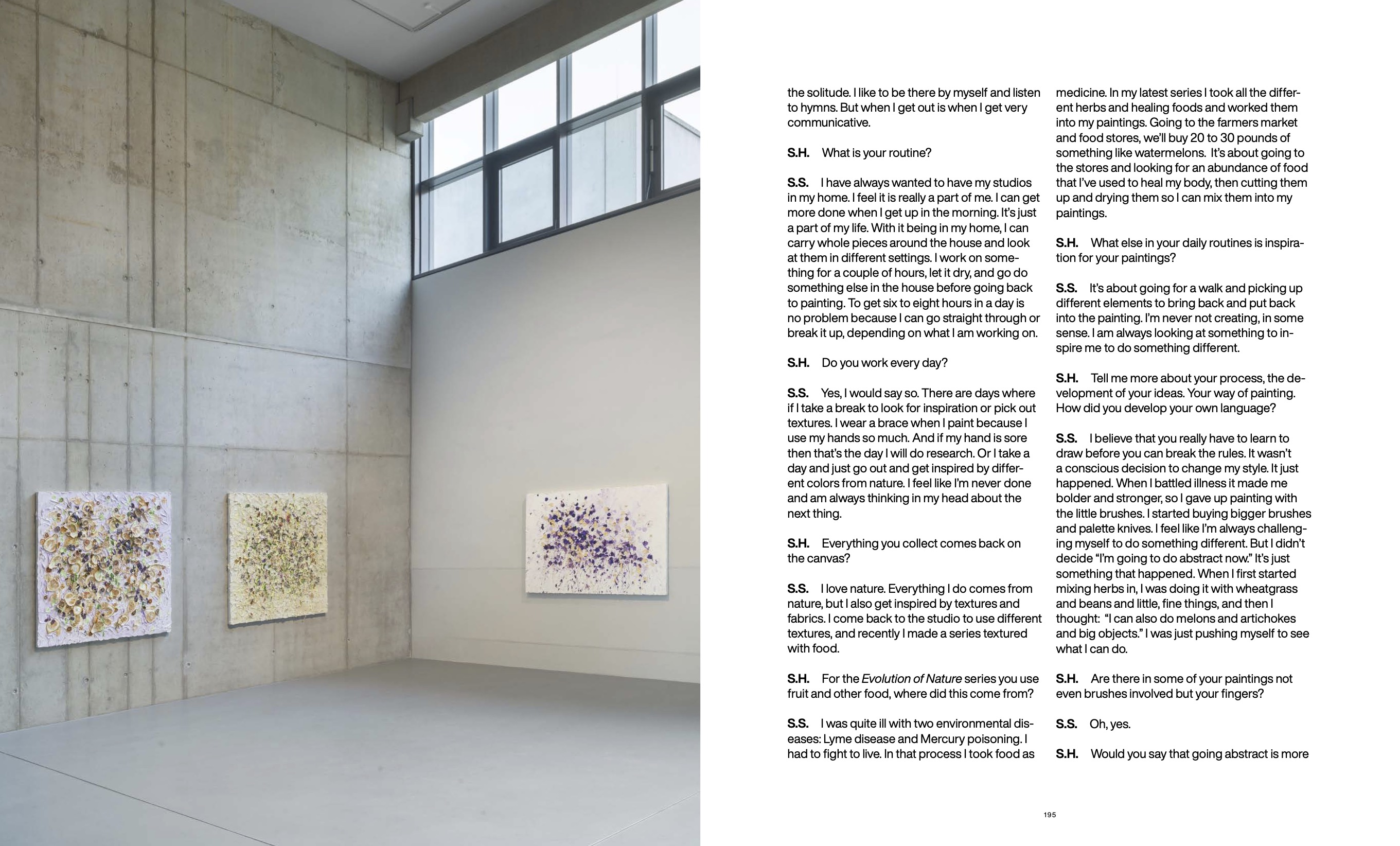 Getrocknete Blüten, Blumen, Pflanzen und Früchte verbinden sich in den Bildern von Susan Swartz mit pastöser Acrylfarbe zu üppigen Leinwand-Bouquets. Ausgehend von der Tradition der Eat-Art und romantischer Naturdarstellungen spannt das facettenreiche Werk der Künstlerin einen Bogen zur expressionistischen Abstraktion. Der Gegenstand löst sich auf in überbordende Farbexplosionen und vibrierende Blumenwiesen.