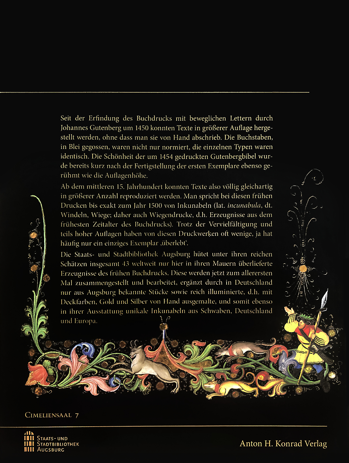 Seit der Erfindung des Buchdrucks mit beweglichen Lettern durch Johannes Gutenberg um 1450 konnten Texte in größerer Auflage hergestellt werden, ohne dass man sie von Hand abschrieb. Die Buchstaben, in Blei gegossen, waren nicht nur normiert, die einzelnen Typen waren identisch.Die Schönheit der um 1454 gedruckten Gutenbergbibel wurde bereits kurz nach der Fertigstellung der ersten Exemplare ebenso gerühmt wie die Auflagenhöhe. Ab dem mittleren 15. Jahrhundert konnten Texte also völlig gleichartig in größerer Anzahl reproduziert werden. Man spricht bei diesen frühen Drucken bis exakt zum Jahr 1500 von Inkunabeln (lat. incunabula, dt. Windeln, Wiege; daher auch Wiegendrucke, d.h. Erzeugnisse aus dem frühesten Zeitalter des Buchdrucks).Trotz der Vervielfältigung und teils hoher Auflagen haben von diesen Druckwerken oft wenige, ja hat häufig nur ein einziges Exemplar 'überlebt'. Die Staats- und Stadtbibliothek Augsburg hütet unter ihren reichen Schätzen insgesamt 43 weltweit nur hier in ihren Mauern überlieferte Erzeugnisse des frühen Buchdrucks.Diese werden jetzt zum allerersten Mal zusammengestellt und bearbeitet, ergänzt durch in Deutschland nur aus Augsburg bekannte Stücke sowie reich illuminierte, d.h. mit Deckfarben, Gold und Silber von Hand ausgemalte, und somit ebenso in ihrer Ausstattung unikale Inkunabeln aus Schwaben, Deutschland und Europa.Alle 43 Raritäten der Ausstellung werden in diesem Katalog vorgestellt: jedes Kunstwerk wird mit einem zweispaltigen Text in Deutsch und Englisch begleitet, gefolgt von einer schönen, ganzseitigen Abbildung.Katalog mit detailgetreuen Abbildungen und exzellenten TextenHergestellt in Deutschland______________________SOLE SURVIVORS & RARE EDITIONSUnique, rare, and illuminated incunabula at the Augsburg State and City Library. Catalogue of the eponymous exhibition, held at Staats- und Stadtbibliothek Augsburg from 24 September through 23 December 2021.Hardcover, 21.0 x 27.5 cm256 pages, cover with gold embossingfeaturing mostly full-page illustrations in 123 colourspublished in September 2021 (1st edition)The advent of Johannes Gutenberg's printing press around 1450 enabled the reproduction of texts in larger editions without having to copy them by hand. The letters, cast in lead, were not only standardized but also identical in their individual types.The beauty of the 1454 Gutenberg Bible has been widely praised ever since the first copies were distributed in unprecedented numbers. With that, from the middle of the 15th century onwards, texts could be reproduced in identical copies and widely circulated. These early prints, produced before the year 1501, are known as incunabula. The term originates in the Latin word incunabulum for "swaddling clothes" or "bands holding the baby in a cradle" - a figurative reference to the infancy of pre-1501 printing technology.Although some of these printed works enjoyed large print runs, few copies have survived into the present day. In many cases, only a single copy remains. Among its many treasures, the Augsburg State and City Library (Staats- und Stadtbibliothek Augsburg) houses 43 unique exemplars of early letterpress printing found nowhere else in the world.For the first time in history, these works are now curated and supplemented by pieces made famous in Germany by the Augsburg collection. The incunabula from Swabia, Germany, and Europe are richly illuminated - hand-painted with brilliant colors and adorned with gold and silver - making them equally unique in their ornamentation.Our catalogue presents all 43 rarities that are on display at this exhibition: Each piece is explained in a two-column layout in German and English, followed by a stunning full-page illustration.Catalogue with detailed reproductions and excellent text informationMade in Germany