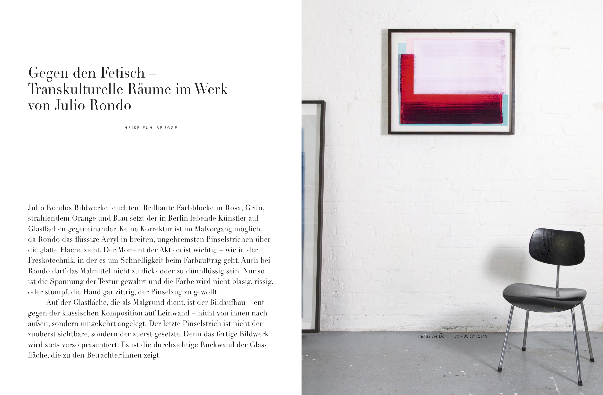 Acrylfarbe auf Glas und Holz bildet zwei physische Ebenen, aus denen sich die großformatigen Bilder von Julio Rondo (geb. 1952 in Sotrondio, Spanien, lebt und arbeitet in Berlin) zusammensetzen. In der Staffelung entsteht dazwischen ein - für die visuelle Erfahrung nicht weniger wichtiger - dritter Raum: ein Hohlraum, der die beiden Malschichten nicht nur voneinander abhebt, sondern sie gleichzeitig miteinander verschmelzen lässt. Wie übereinander gelagerte Folien verbinden sich in der Betrachtung unterschiedliche autarke Schichten zu vibrierenden Farbhybriden. Die malerische Fläche wird bei näherer Untersuchung zum Raum und schließlich wieder zur Fläche. Bezüge zu Philosophie, Musik oder zu persönlichen Erinnerungen ergänzen die Werke durch die Wahl der Titel um eine zusätzliche Dimension.
