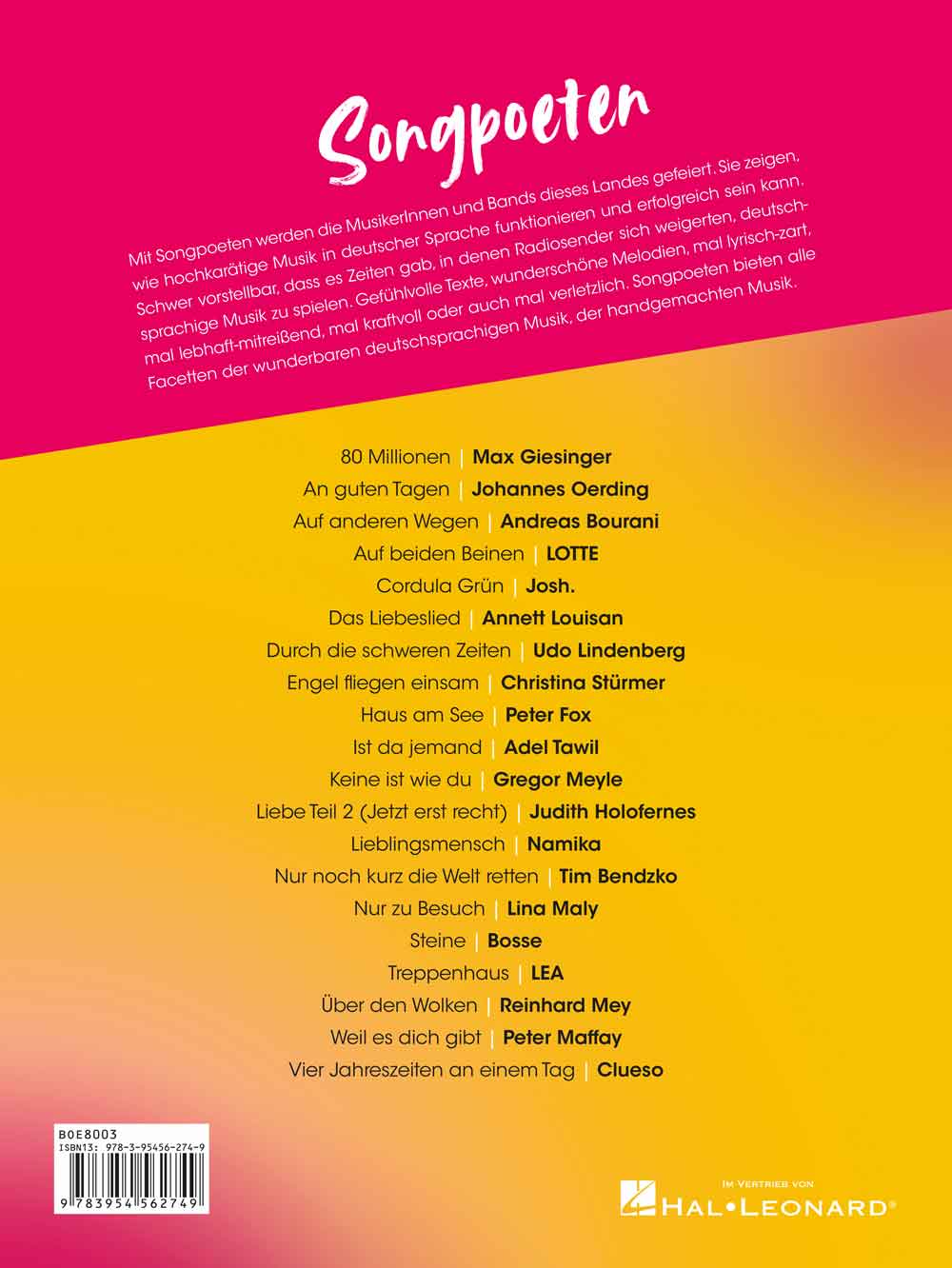 Mit Songpoeten werden die MusikerInnen und Bands dieses Landes gefeiert. Sie zeigen, wie hochkarätige Musik in deutscher Sprache funktionieren und erfolgreich sein kann. Schwer vorstellbar, dass es Zeiten gab, in denen Radiosender sich weigerten, deutschsprachige Musik zu spielen. Gefühlvolle Texte, wunderschöne Melodien, mal lyrisch-zart, mal lebhaft-mitreißend, mal kraftvoll oder auch mal verletzlich. Songpoeten bieten alle Facetten der wunderbaren deutschsprachigen Musik, der handgemachten Musik.Songpoeten sind Singer-Songwriter, deren Musik der Tradition genau wie der Gegenwart verpflichtet ist. Großmeister wie Peter Maffay, Reinhard Mey oder Udo Lindenberg stehen hier neben aktuellen KünstlerInnen wie Annett Louisan, Tim Bendzko, Bosse, Christina Stürmer, Max Giesinger, LOTTE, Adel Tawil u.a. So unterschiedlich diese Songpoeten auch sein mögen, eines haben sie gemeinsam: Sie haben etwas zu sagen, sind authentisch und erzählen Geschichten mit ihren Songs.Alle 20 Stücke sind für Klavier, Gesang und Gitarre arrangiert. Die Spiralbindung erleichtert das Blättern der Seiten.