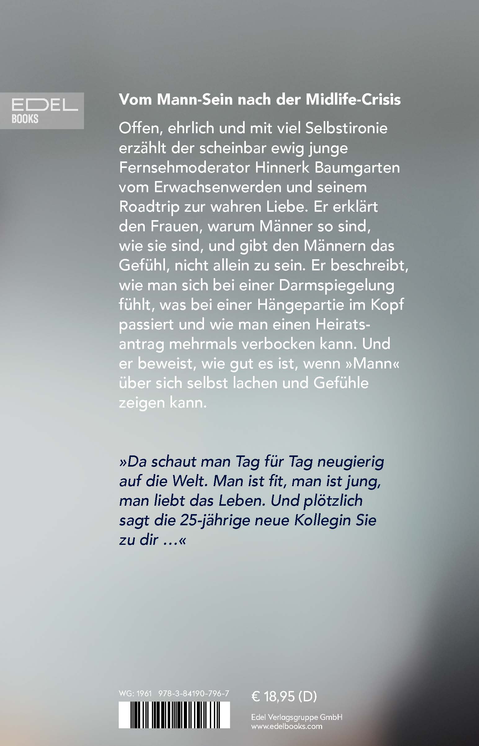 Mit viel Humor und Selbstironie erzählt Hinnerk Baumgarten vom Erwachsenwerden mit 50 und seinem Roadtrip zur wahren Liebe. Dabei gibt er tiefe Einblicke in das Mann-sein, ohne die jugendliche Neugier und den Tatendrang zu verlieren. Offen und ohne Tabus beschreibt er, wie man sich bei einer Blasenspiegelung fühlt, was bei einer Hängepartie wirklich passiert oder wie man einen Heiratsantrag mehrmals verbocken kann. Er zeigt den Frauen, warum Männer so sind, wie sie sind und gibt den Männern das Gefühl, nicht allein zu sein. Und er beweist, dass "Mann" durchaus über sich selbst lachen und Gefühle zeigen kann.
