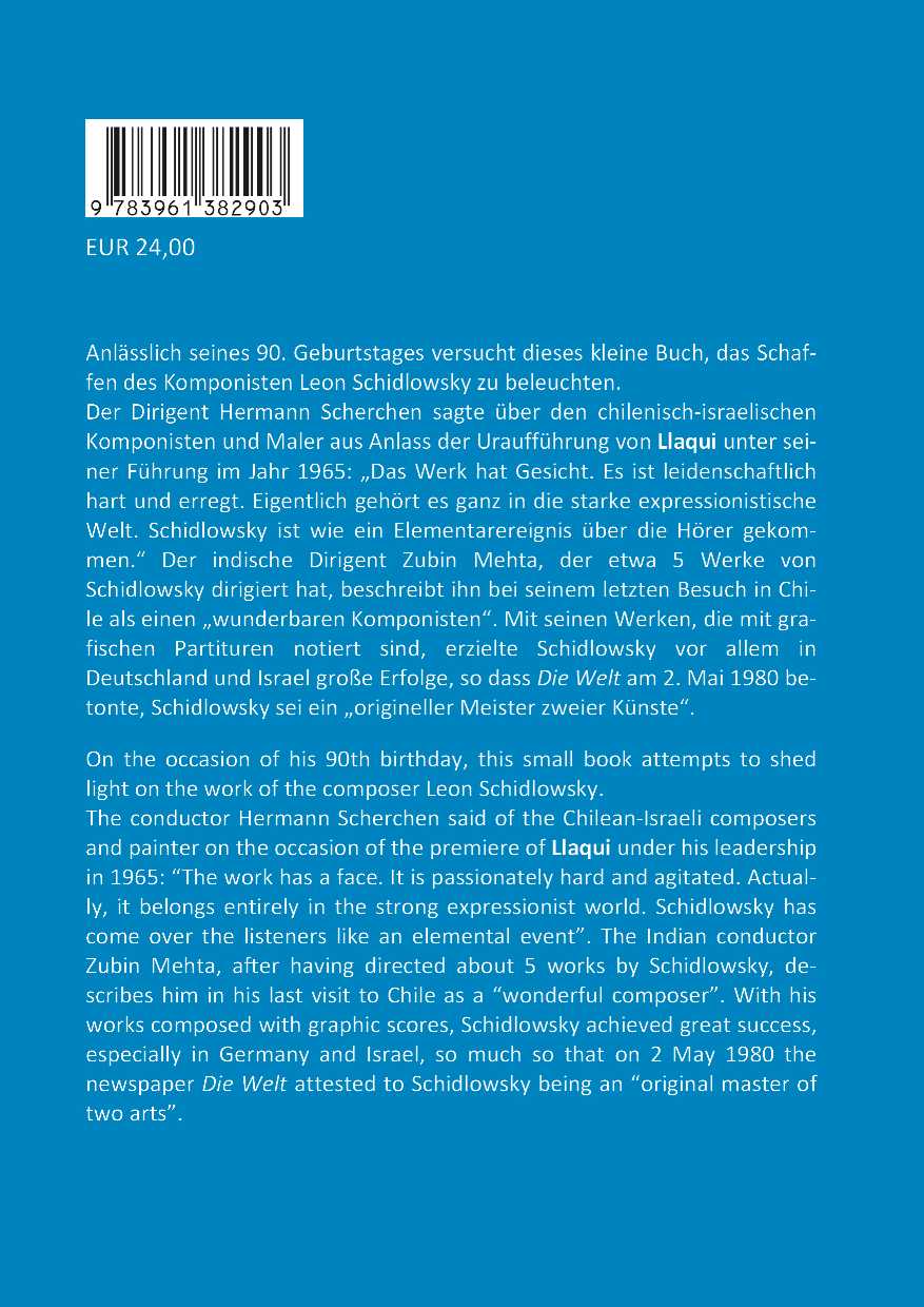 Der Dirigent Hermann Scherchen sagte über den chilenisch-israelischen Komponisten und Maler aus Anlass der Uraufführung von Llaqui unter seiner Führung im Jahr 1965: „Das Werk hat Gesicht. Es ist leidenschaftlich hart und erregt. Eigentlich gehört es ganz in die starke expressionistische Welt. Schidlowsky ist wie ein Elementarereignis über die Hörer gekommen.“ Der indische Dirigent Zubin Mehta, der etwa 5 Werke von Schidlowsky dirigiert hat, beschreibt ihn bei seinem letzten Besuch in Chile als einen „wunderbaren Komponisten“. Mit seinen Werken, die mit grafischen Partituren notiert sind, erzielte Schidlowsky vor allem in Deutschland und Israel große Erfolge, so dass Die Welt am 2. Mai 1980 betonte, Schidlowsky sei ein „origineller Meister zweier Künste“. On the occasion of his 90th birthday, this small book attempts to shed light on the work of the composer Leon Schidlowsky.
