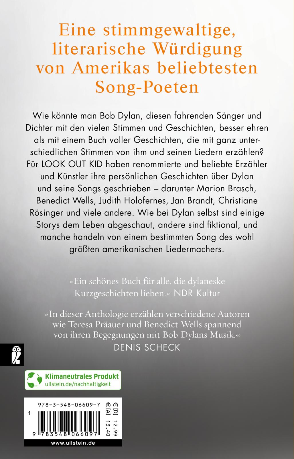 Eine stimmgewaltige, literarische Würdigung von Amerikas beliebtesten Song-Poeten Wie könnte man Bob Dylan, diesen fahrenden Sänger und Dichter mit den vielen Stimmen und Geschichten, zu seinem 80. Geburtstag besser ehren als mit einem Buch voller Geschichten, die mit ganz unterschiedlichen Stimmen von ihm und seinen Liedern erzählen? Für LOOK OUT KID haben renommierte und beliebte Erzähler und Künstler ihre persönlichen Geschichten über Dylan und seine Songs geschrieben - darunter Benedict Wells, Judith Holofernes, Jan Brandt, Christiane Rösinger und viele andere. Wie bei Dylan selbst sind einige Storys dem Leben abgeschaut, andere sind fiktional, und manche handeln von einem bestimmten Song des wohl größten amerikanischen Songwriters.