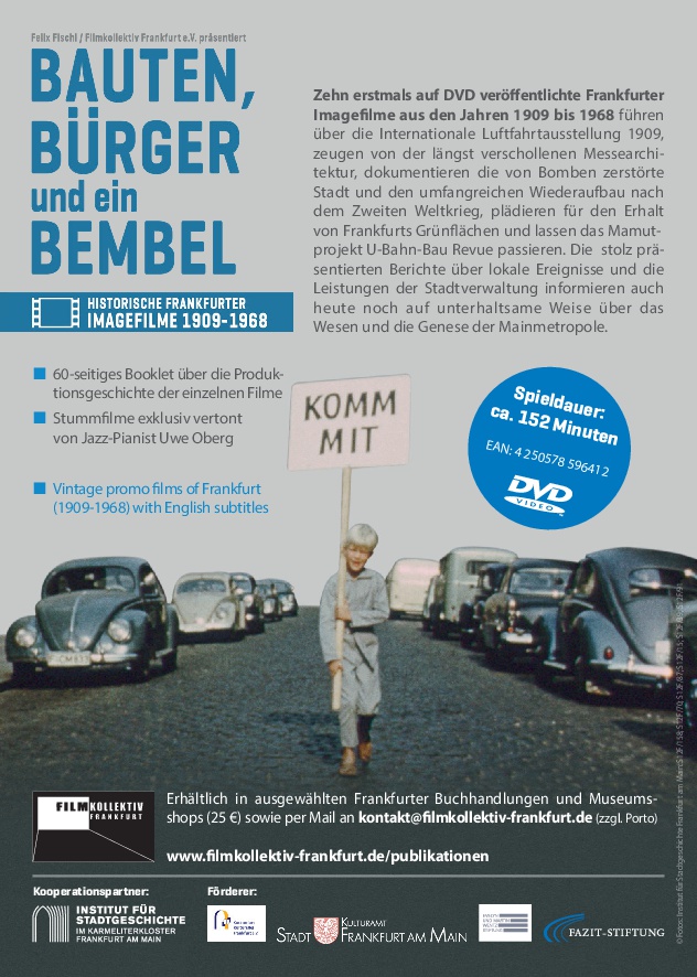 Zehn erstmals auf DVD veröffentlichte Frankfurter Imagefilme aus den Jahren 1909 bis 1968 führen über die Internationale Luftfahrtausstellung 1909, zeugen von der längst verschollenen Messearchitektur, dokumentieren die von Bomben zerstörte Stadt und den umfangreichen Wiederaufbau nach dem Zweiten Weltkrieg, plädieren für den Erhalt von Frankfurts Grünflächen und lassen das Mammutprojekt U-Bahn-Bau Revue passieren. Die stolz präsentierten Berichte über lokale Ereignisse und die Leistungen der Stadtverwaltung informieren auch heute noch auf unterhaltsame Weise über das Wesen und die Genese der Mainmetropole.