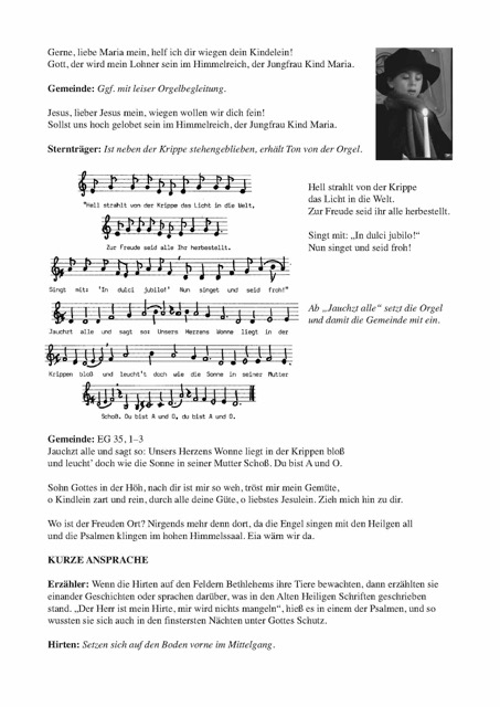 Die ganze Christvesper ein gesungenes Krippenspiel. Einfach die Weihnachtsgeschichte. Ökumenisch – sowie ad libitum kürz- und erweiterbar. Dauer: Je nach Zusammenstellung 30 bis 60 Minuten.