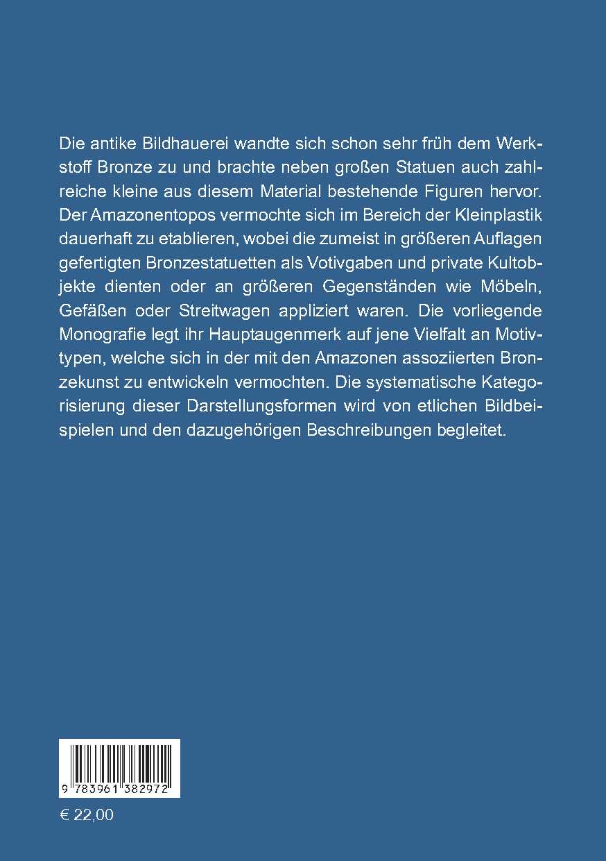Die antike Bildhauerei wandte sich schon sehr früh dem Werkstoff Bronze zu und brachte neben großen Statuen auch zahlreiche kleine aus diesem Material bestehende Figuren hervor. Der Amazonentopos vermochte sich im Bereich der Kleinplastik dauerhaft zu etablieren, wobei die zumeist in größeren Auflagen gefertigten Bronzestatuetten als Votivgaben und private Kultobjekte dienten oder an größeren Gegenständen wie Möbeln, Gefäßen oder Streitwagen appliziert waren. Die vorliegende Monografie legt ihr Hauptaugenmerk auf jene Vielfalt an Motivtypen, welche sich in der mit den Amazonen assoziierten Bronzekunst zu entwickeln vermochten. Die systematische Kategorisierung dieser Darstellungsformen wird von etlichen Bildbeispielen und den dazugehörigen Beschreibungen begleitet.