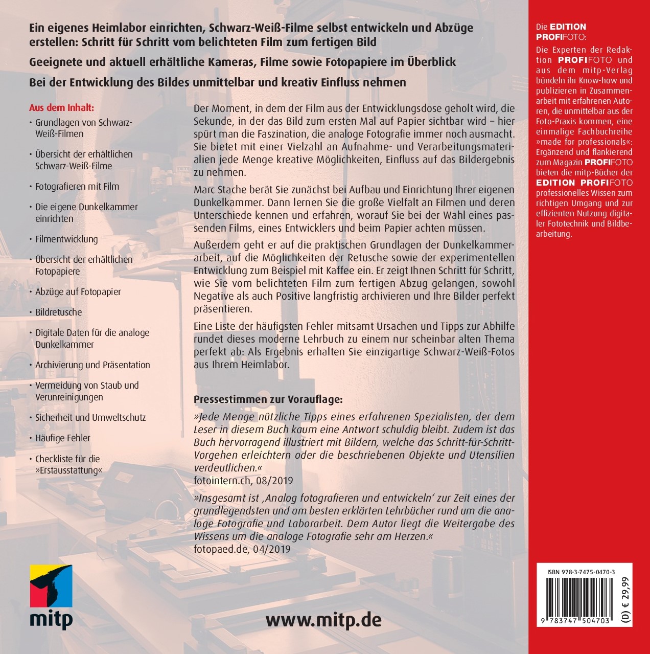 Eine Liste der häufigsten Fehler mitsamt Ursachen und Tipps zur Abhilfe rundet dieses moderne Lehrbuch zu einem nur scheinbar alten Thema perfekt ab: Als Ergebnis erhalten Sie einzigartige Schwarz-Weiß-Fotos aus Ihrem Heimlabor.