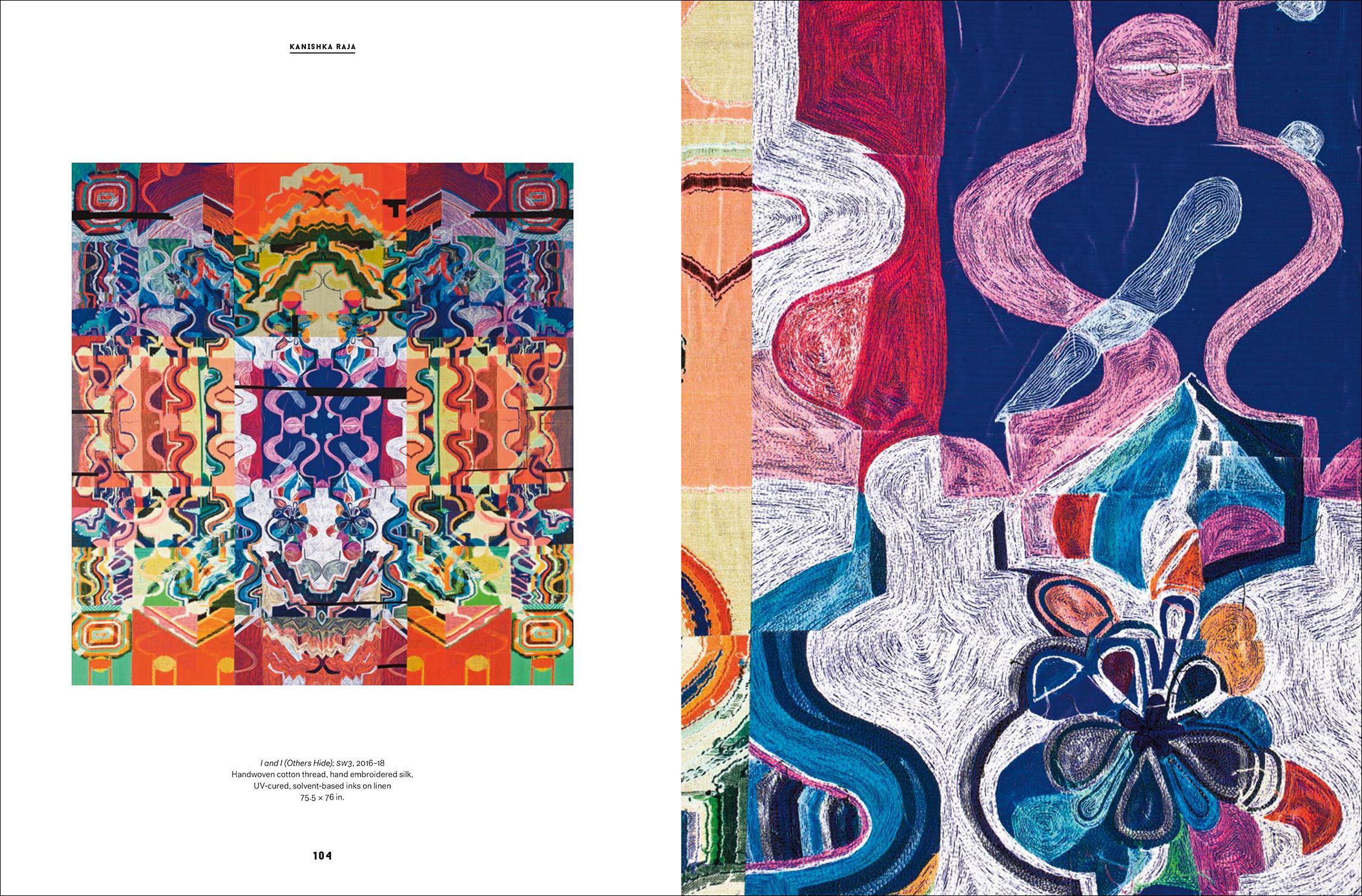 Kanishka Rajas prachtvoll gemusterte Werke erkunden, wie er selbst es ausdrückte, "die Schnittstellen zwischen Abbildung, Handwerk und Technologie sowie die Bruchstellen bei der Weitergabe von Informationen." Seine konzeptionell fesselnde, ästhetisch berückende Reihe "I and I" konfrontiert Gemälde mit ihren gewebten, gescannten, gedruckten, gestickten und reproduzierten Pendants.