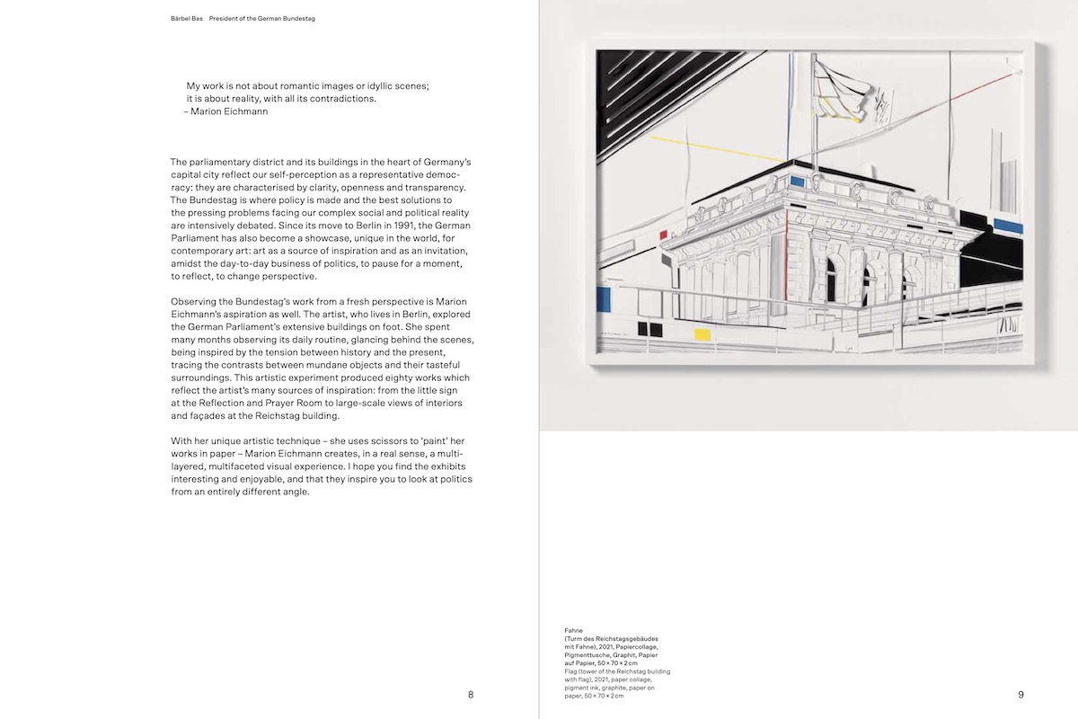 lt;p>Marion Eichmann verbrachte viele Wochen im Reichstagsgebäude, im Paul-Löbe-, Marie-Elisabeth-Lüders- und Jakob-Kaiser-Haus. Sie besuchte nicht nur den Plenarsaal, die Fraktionsebene oder die Ausschusssäle, sondern sie beobachtete auch in Gängen, Kantinen, Bibliotheken und Verbindungstunneln den Alltag einer hochkomplexen Maschinerie, die das Herz der Demokratie fast unsichtbar am Schlagen hält. Dabei richtete sich ihr Interesse sowohl auf medial bekannte Räume und ikonische Fassaden als auch auf selten sichtbare Arbeitsräume, Maschinen, Hinweisschilder und Geräte, die für den reibungslosen Ablauf des täglichen Betriebs dieses Hohen Hauses unerlässlich sind. Die im Rahmen eines Auftragsprojekts entstandene Serie von mehr als 80 Papierschnitten wird in diesem Buch geschlossen dokumentiert und gibt darüber hinaus Einblicke in den Entstehungsprozess und die Arbeitsweise der Künstlerin.