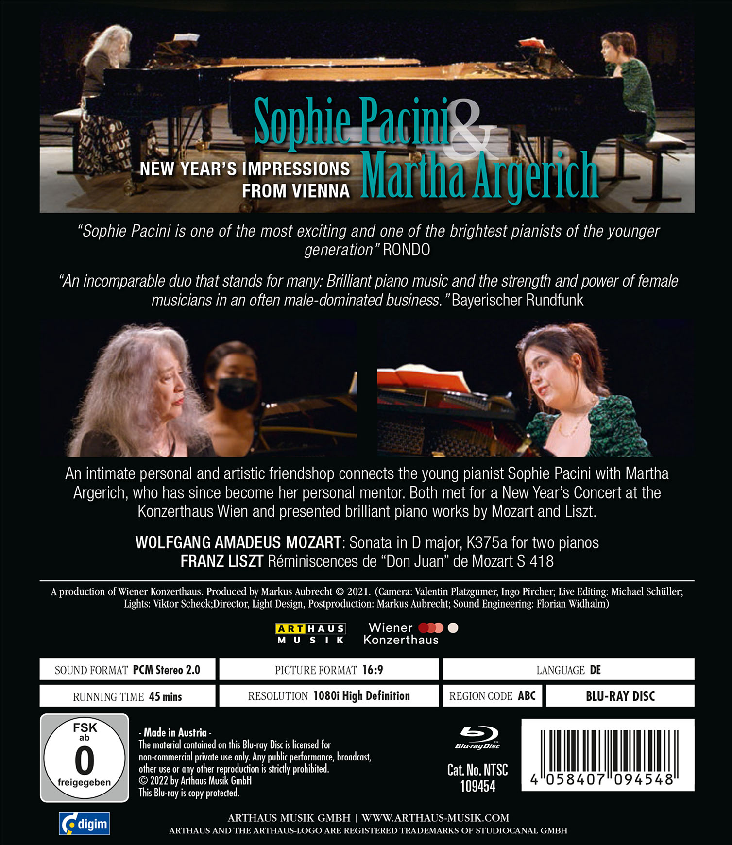 Martha Argerich, Ehrenmitglied der Wiener Konzerthausgesellschaft, gilt als eine der größten Pianistinnen unserer Zeit. Ihr Spiel begeistert durch enorme lyrische Empfi ndsamkeit, Temperament und fesselnde Brillanz. Sophie Pacini hingegen wird ob ihres »effektgeladenen, aber nie affektierten Klavierspiels« von der Kritik gelobt und von ihren Fans geliebt: Unverwechselbar ihr weicher Anschlag und der sonnig gleißende Diskant. Pacini spielt vor allem aus zwei Gründen: Weil sie stets ihre eigene Musikbegeisterung teilen will, und weil sie oft, wie sie sagt, »ihrer Seele Platz machen möchte«.Eine innige persönliche und künstlerische Freundschaft verbindet Sophie Pacini mit Martha Argerich, die inzwischen zu ihrer Mentorin avancierte. Die beiden Pianistinnen erfüllen mit vier Händen und Werken von Mozart und Liszt den digitalen Konzertsaal mit festlichem Glanz."Sophie Pacini ist eine der aufregendsten und klügsten Pianistinnen der jungen Generation." (RONDO)"Ein unvergleichliches Duo, das für vieles steht: Brillante Klaviermusik sowie die Stärke und Kraft von Musikerinnen in einem oft von Männer dominierten Business." (Bayerischer Rundfunk)