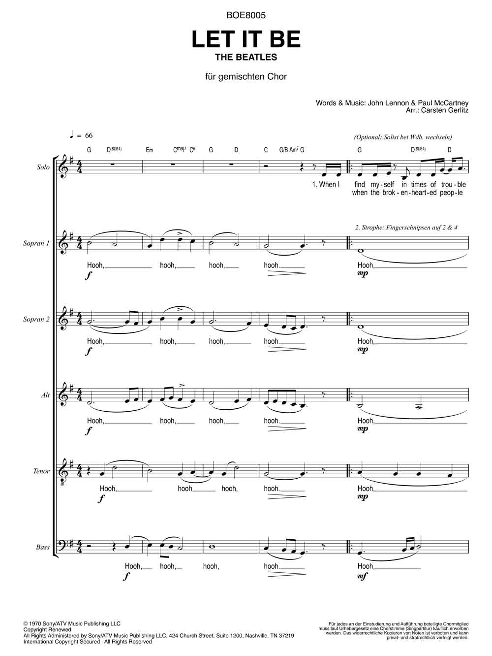 Als sich die Beatles 1969 im Studio für ein neues Album trafen, herrschte schlechte Stimmung. Die Band stand kurz vor der Auflösung. Immer wieder gab es Streitereien. In einer seiner schlaflosen Nächte, so berichtete Paul McCartney später, erschien ihm seine früh verstorbene Mutter Mary. Es gab ihm Kraft und Trost und Inspiration zu dieser Melodie. LET IT BE wurde zu einem der schönsten Trostspender-Hits der Popgeschichte. "Lass es geschehen", "Lass gut sein" - alles wird gut. Das vorliegende A-capella-Arrangement von Carsten Gerlitz bietet Chören den Popklassiker in einer liebevollen Bearbeitung an.Die Chormappe enthält die Singpartitur für SSATB in 10facher Ausführung.