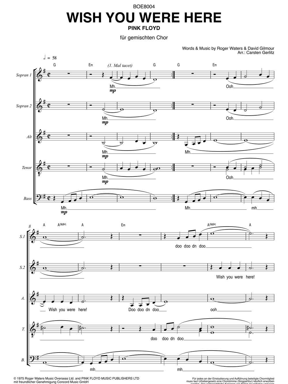 Jeder Lagerfeuergitarrist beherrscht die weltbekannte Einleitung zu einem der größten PINK-FLOYD-Hits. Die Band verarbeitete mit dem Song und dem gleichnamigen Album den Weggang und psychischen Verfall ihres früheren Gitarristen Syd Barrett. Aber der Text steht auch für die "drohende Entfremdung von sich selbst" (Roger Waters) und hat an Aktualität nichts eingebüßt. Carsten Gerlitz hat in dem vorliegenden A-capella-Arrangement den Popklassiker WISH YOU WERE HERE für gemischten Chor aufbereitet. Pink Floyd im Chorkonzert - das kann sehr cool werden! Eine verzaubernde Ballade.Die Chormappe enthält die Singpartitur für SSATB in 10facher Ausführung.