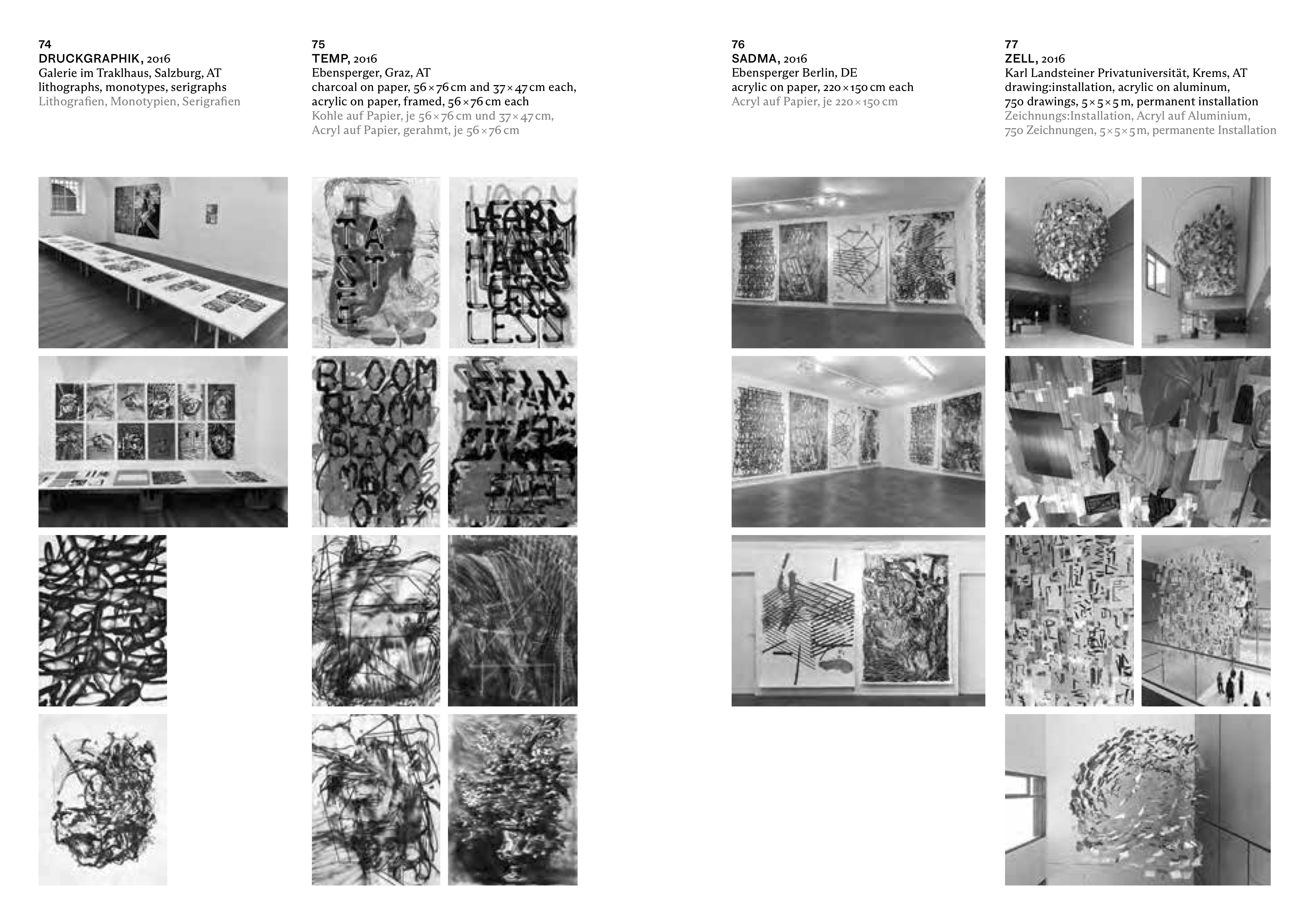 Der umfangreiche Bildband DRAWN zeigt neben einem künstlerischen Teil eine Chronologie von über 100 Projekten. Die im Duplexdruckverfahren hergestellte Publikation greift durch den Zweifarbdruck ein zentrales Stilmittel Schwarzwalds in Buchform auf. Die Texte schrieben Elsy Lahner, Ann Cotten, Sebastian Egenhofer und Marcus Steinweg.
