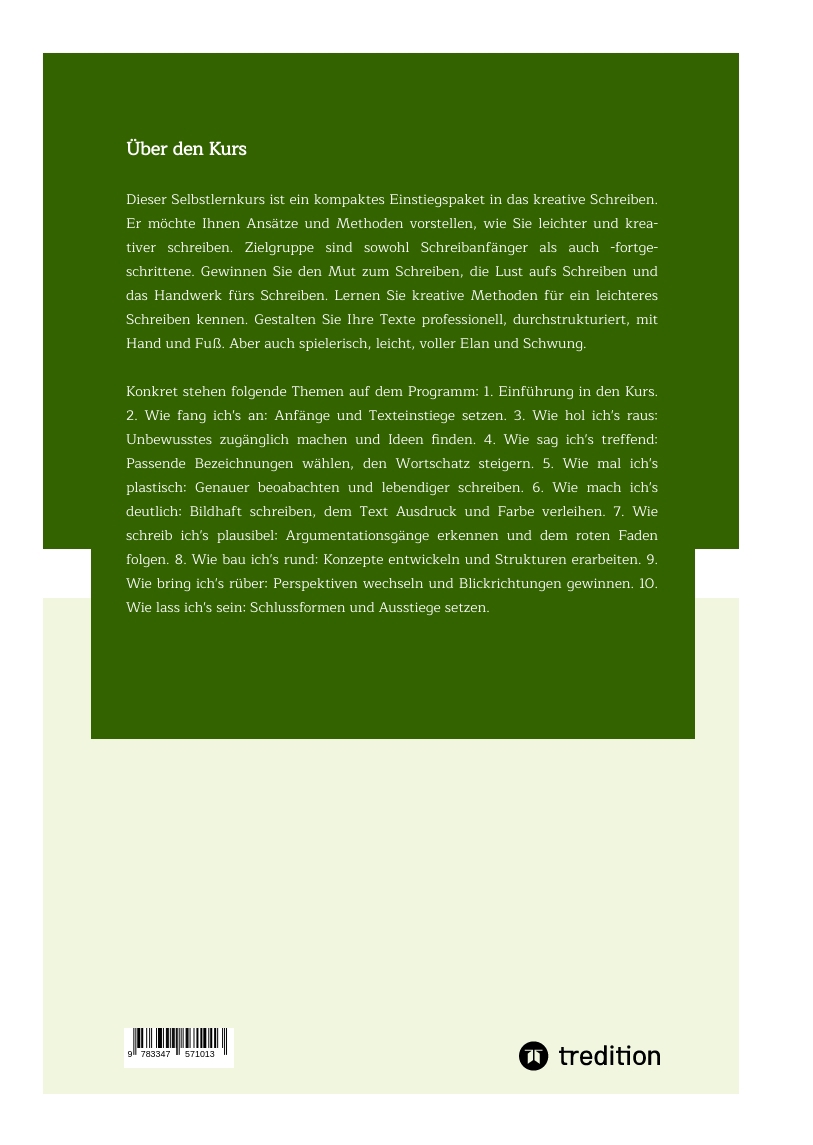 | Schlagworte | angst beim schreiben • ängste beim schreiben • ängste vor dem schreiben • Angst vor dem Schreiben • Besser schreiben • besser schreiben lernen • Buch • Coaching • eBook • E-Book • einfacher schreiben • einfach schreiben • gut schreiben • gut schreiben lernen • Hilfe • Ins schreiben kommen • Kreativ • kreativer • kreativer schreiben • kreative Schreibmethode • kreative schreibmethode lernen • kreative Schreibmethoden • kreative Schreibmethoden kennenlernen • kreative Schreibmethoden lernen • kreative Schreibtechnik • kreative Schreibtechniken • kreative Schreibtechniken kennenlernen • kreative Schreibtechniken lernen • kreative schreibtechnik lernen • Kreatives Schreiben • kreatives Schreiben lernen • Kreativ Schreiben • kreativ schreiben lernen • Kurs • leichter schreiben • leicht schreiben • Mit dem Schreiben anfangen • mit dem Schreiben beginnen • online schreiben lernen • Ratgeber • Richtig schreiben • richtig schreiben lernen • Schreibanfänger • Schreibanfängerin • Schreibangst • Schreibängste • Schreibblockade • Schreibblockaden • Schreibbuch • Schreibcoaching • Schreiben • schreiben können • Schreiben lernen • schreiben lernen online • schreiben online lernen • Schreibhandwerk • Schreibhilfe • Schreibkurs • Schreibratgeber • Schreibseminar • Schreibwerkzeug • schreibwiderstand • schreibwiderstände • Schreibworkshop • Selbstlernkurs • Seminar • spielerisch schreiben • wie fange ich an zu schreiben • wie kann ich besser schreiben • wie kann ich einfacher schreiben • wie kann ich einfach schreiben • wie kann ich ins schreiben kommen • wie kann ich kreativer schreiben • wie kann ich kreative schreibmethoden lernen • wie kann ich kreative schreibtechniken lernen • wie kann ich kreatives schreiben lernen • wie kann ich kreativ schreiben • wie kann ich leichter schreiben • wie kann ich leicht schreiben • wie kann ich mit dem schreiben anfangen • wie kann ich mit dem Schreiben beginnen • wie kann ich schreiben lernen • wie komme ich ins Schreiben • Workshop |
