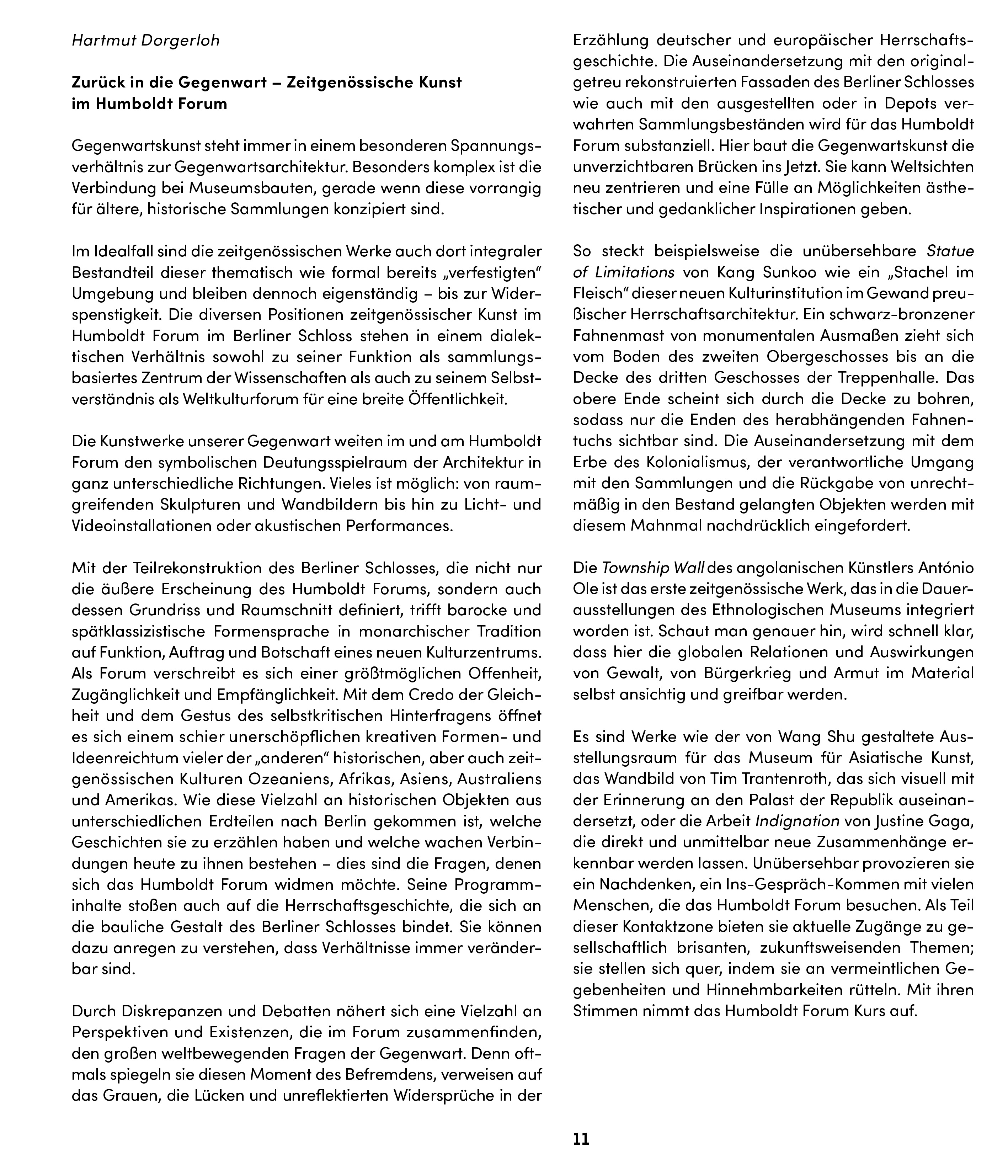 Ein japanisches Teehaus, eine Soundinstallation mit nigerianischen Klängen, ein zweigeteilter Flaggenmast aus Bronze: Auf den weiten Flächen des Berliner Humboldt Forums sind zahlreiche, teils raumgreifende Werke zeitgenössischer Kunst zu entdecken. In den Ausstellungen des Ethnologischen Museums und des Museums für Asiatische Kunst bereichern Werke von Künstler*innen aus verschiedenen Herkunftsgesellschaften die Sammlungen. Daneben wurden im Humboldt Forum sieben Werke der Kunst am Bau realisiert, die sich mit der Geschichte des Ortes oder mit dem Humboldt Forum als „Ort der Welt", der Begegnung und des Austauschs befassen oder die Namensgeber Wilhelm und Alexander von Humboldt würdigen. Dieses Buch stellt die Kunstwerke in informativen und assoziationsreichen Texten sowie eindrucksvollen Fotografien vor.