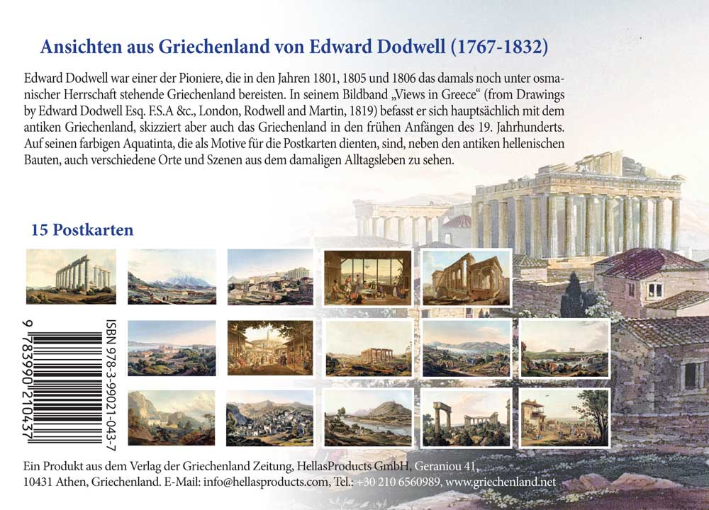 Dieses Set mit 15 Ansichten aus Griechenland von Edward Dodwell (1767-1832) zeigt lebendig und farbenfroh die Welt des 19. Jahrhunderts in Hellas und ist ein ideales Geschenk für Philhellenen. Edward Dodwell war einer der Pioniere, die in den Jahren 1801, 1805 und 1806 das damals noch unter osmanischer Herrschaft stehende Griechenland bereisten. In seinem Bildband "Views in Greece" (from Drawings by Edward Dodwell Esq. F.S.A &c., London, Rodwell and Martin, 1819) befasst er sich hauptsächlich mit dem antiken Griechenland, skizziert aber auch das Griechenland in den frühen Anfängen des 19. Jahrhunderts. Auf seinen farbigen Aquatinta, die als Motive für die Postkarten dienten, sind, neben den antiken hellenischen Bauten, auch verschiedene Orte und Szenen aus dem damaligen Alltagsleben zu sehen.Zu den bekanntesten Werken des irischen Schriftstellers und Altertumsforschers Dodwell zählt "Classical and topographical tour through Greece", erschienen in London 1818, auf Deutsch 1821 ("Classische und topographische Reise durch Griechenland während der Jahre 1801, 1805 und 1806").