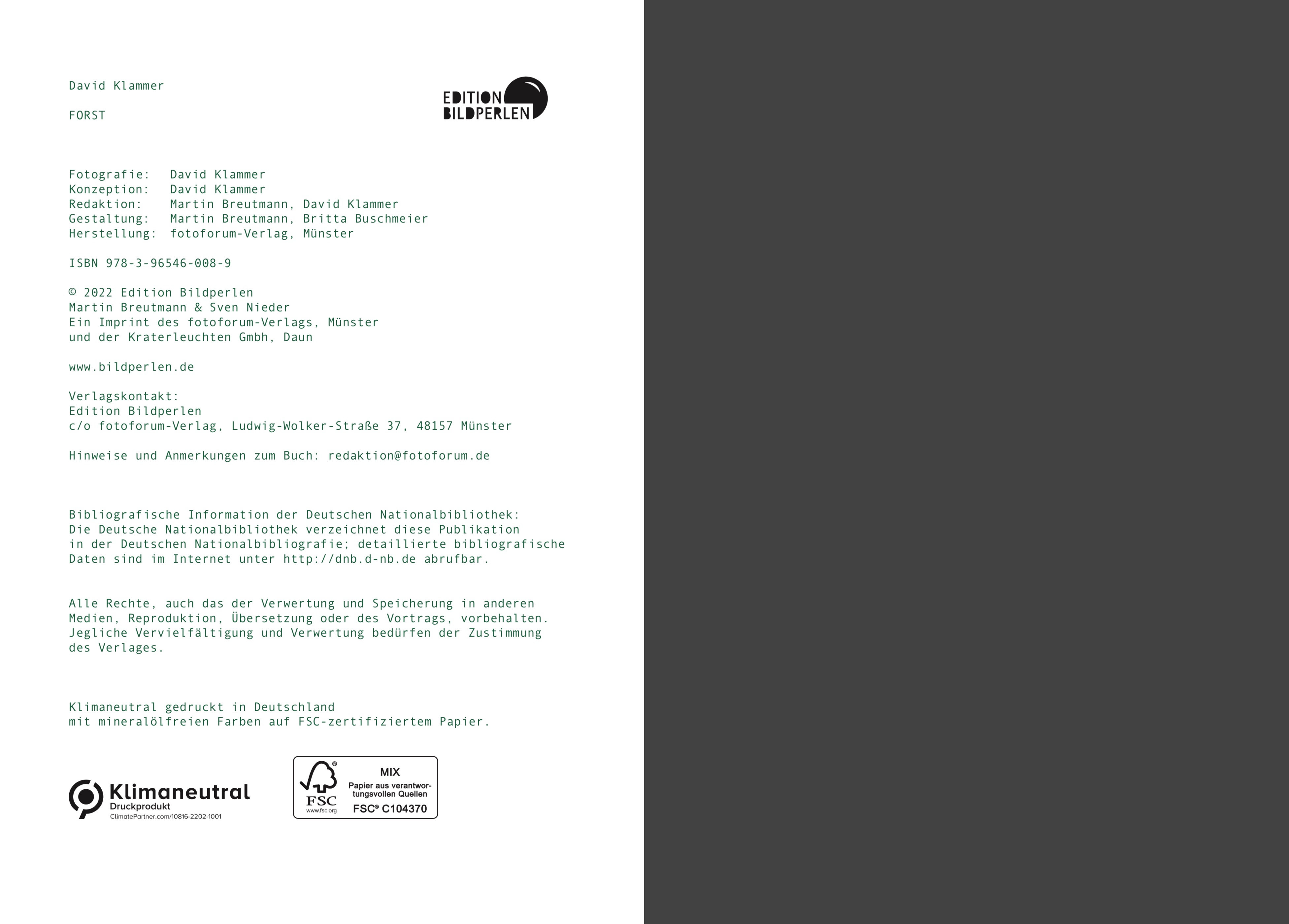 David Klammer, Jahrgang 1961, lebt mit seiner Familie in Köln. Der Fotojournalist ist Mitglied der Kölner Bild- und Reportageagentur laif. Seine Arbeiten wurden mehrfach international ausgezeichnet. So erhielt er 2019 für seine Serie „Kampf um den Forst“ den 1. Preis beim Deutschen Preis für politische Fotografie und Karikatur, 2012 belegte er den 1. Platz in der Kategorie „Reportage“ beim Deutschen Preis für Wissenschaftsfotografie und 2007 bekam er für seine Reportage über Fußballfans bei der WM 2006 den 3. Preis bei dem renommierten Wettbewerb World Press Photo. David Klammer publiziert in namhaften Magazinen, darunter STERN Magazin, GEO Magazin, DER SPIEGEL, DIE ZEIT, CAPITAL, TIME Magazine, Wirtschaftswoche, Mercedes Classic Magazin, Nissan Magazin, Lufthansa Exclusive und Chrismon. In der Edition Bildperlen ist von David Klammer bereits das Buch „Good Morning Auroville – Die utopische Stadt der Morgendämmerung“ erschienen. Es wurde beim Deutschen Fotobuchpreis ausgezeichnet und steht dort auf der Longlist.