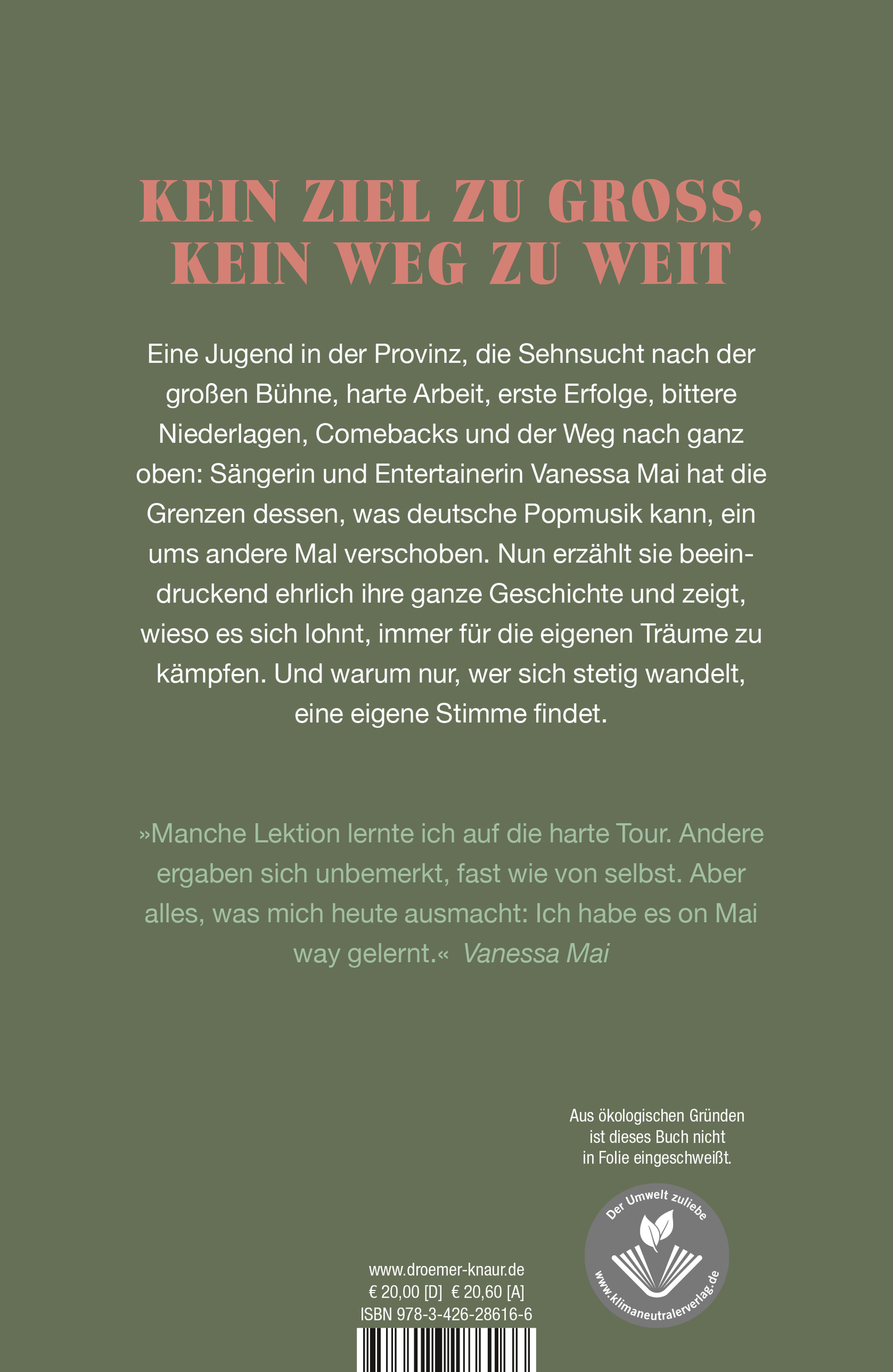 Sängerin, Schauspielerin, Tänzerin, Social-Media-Star - Vanessa Mai ist Multitalent und Vollblut-Entertainerin. Jetzt erzählt sie zum ersten Mal, wie sie dorthin gekommen ist, wo sie heute steht. Sie berichtet von schwierigen Anfängen, dem steilen Aufstieg auf den deutschen Schlager-Olymp, von ihren Wünschen, Ängsten und warum es sich lohnt, für die eigenen Ziele und Überzeugungen einzustehen. Allen Bedenken zum Trotz.