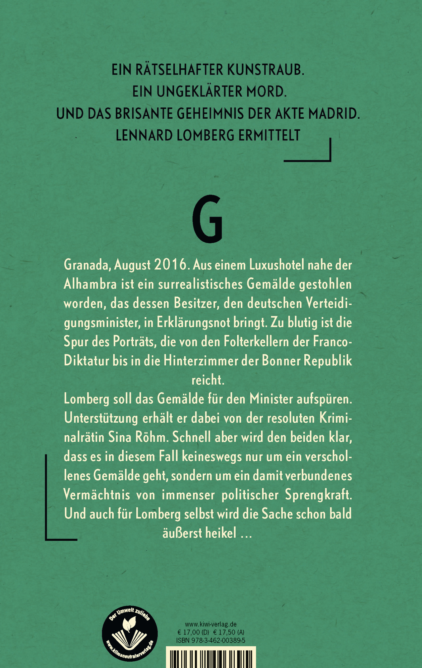 Granada im Sommer 2016. Bei einem Einbruch in ein Luxushotel nahe der Alhambra ist ein surrealistisches Gemälde gestohlen worden, das dessen Besitzer, den deutschen Verteidigungsminister, in große Erklärungsnot bringt. Zu blutig ist die Spur des Gemäldes, die von den Folterkellern der Franco-Diktatur bis in die Ministerien der Bonner Republik reicht.