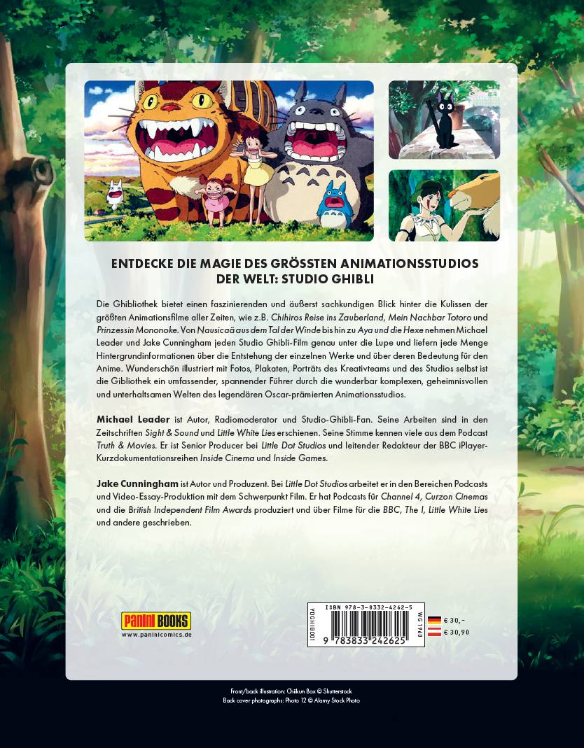 ENTDECKE DIE MAGIE DES GRÖSSTEN ANIMATIONSSTUDIOS DER WELT: STUDIO GHIBLI Die Ghibliothek bietet einen faszinierenden und äußerst sachkundigen Blick hinter die Kulissen der größten Animationsfilme aller Zeiten, wie z.B. Chihiros Reise ins Zauberland, Mein Nachbar Totoro und Prinzessin Mononoke. Von Nausicaä aus dem Tal der Winde bis hin zu Aya und die Hexe nehmen Michael Leader und Jake Cunningham jeden Studio Ghibli-Film genau unter die Lupe und liefern jede Menge Hintergrundinformationen über die Entstehung der einzelnen Werke und über deren Bedeutung für den Anime. Wunderschön illustriert mit Fotos, Plakaten, Porträts des Kreativteams und des Studios selbst ist die Gibliothek ein umfassender, spannender Führer durch die wunderbar komplexen, geheimnisvollen und unterhaltsamen Welten des legendären Oscar-prämierten Animationsstudios. Michael Leader ist Autor, Radiomoderator und Studio-Ghibli-Fan. Seine Arbeiten sind in den Zeitschriften Sight & Sound und Little White Lies erschienen. Seine Stimme kennen viele aus dem Podcast Truth & Movies. Er ist Senior Producer bei Little Dot Studios und leitender Redakteur der BBC iPlayer- Kurzdokumentationsreihen Inside Cinema und Inside Games. Jake Cunningham ist Autor und Produzent. Bei Little Dot Studios arbeitet er in den Bereichen Podcasts und Video-Essay-Produktion mit dem Schwerpunkt Film. Er hat Podcasts für Channel 4, Curzon Cinemas und die British Independent Film Awards produziert und über Filme für die BBC, The I, Little White Lies und andere geschrieben.
