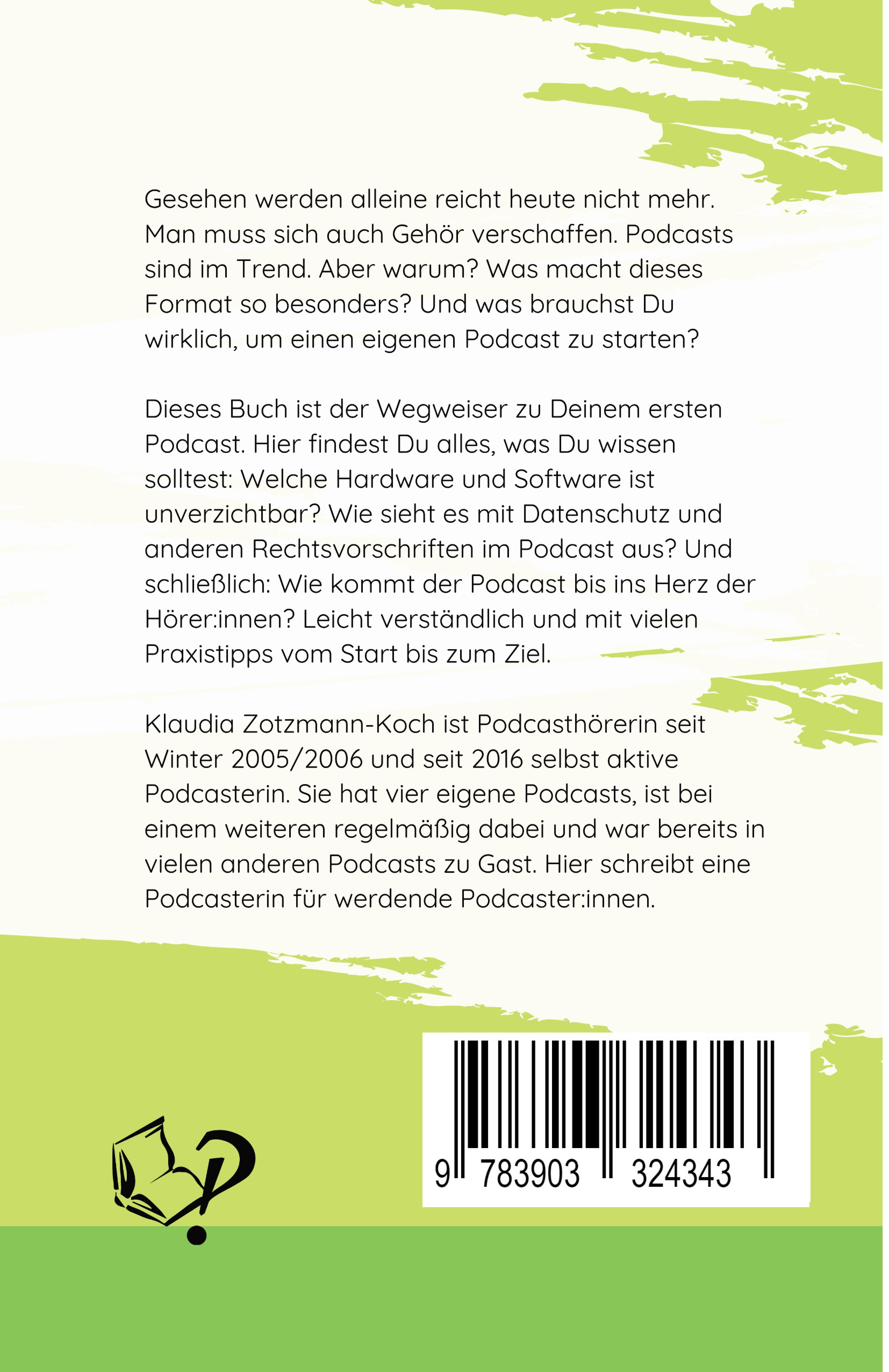 Gesehen werden alleine reicht heute nicht mehr. Man muss sich auch Gehör verschaffen. Podcasts sind im Trend. Aber warum? Was macht dieses Format so besonders? Und was brauchst Du wirklich, um einen eigenen Podcast zu starten?Dieses Buch ist der Wegweiser zu Deinem ersten Podcast. Hier findest Du alles, was Du wissen solltest: Welche Hardware und Software ist unverzichtbar? Wie sieht es mit Datenschutz und anderen Rechtsvorschriften im Podcast aus? Und schließlich: Wie kommt der Podcast bis ins Herz der Hörer:innen? Leicht verständlich und mit vielen Praxistipps vom Start bis zum Ziel.Klaudia Zotzmann-Koch ist Podcasthörerin seit Winter 2005/2006 und seit 2016 selbst aktive Podcasterin. Sie hat vier eigene Sendungen, ist bei einer weiteren regelmäßig dabei und war bereits in vielen anderen Podcasts zu Gast. Hier schreibt eine Podcasterin für werdende Podcaster:innen.