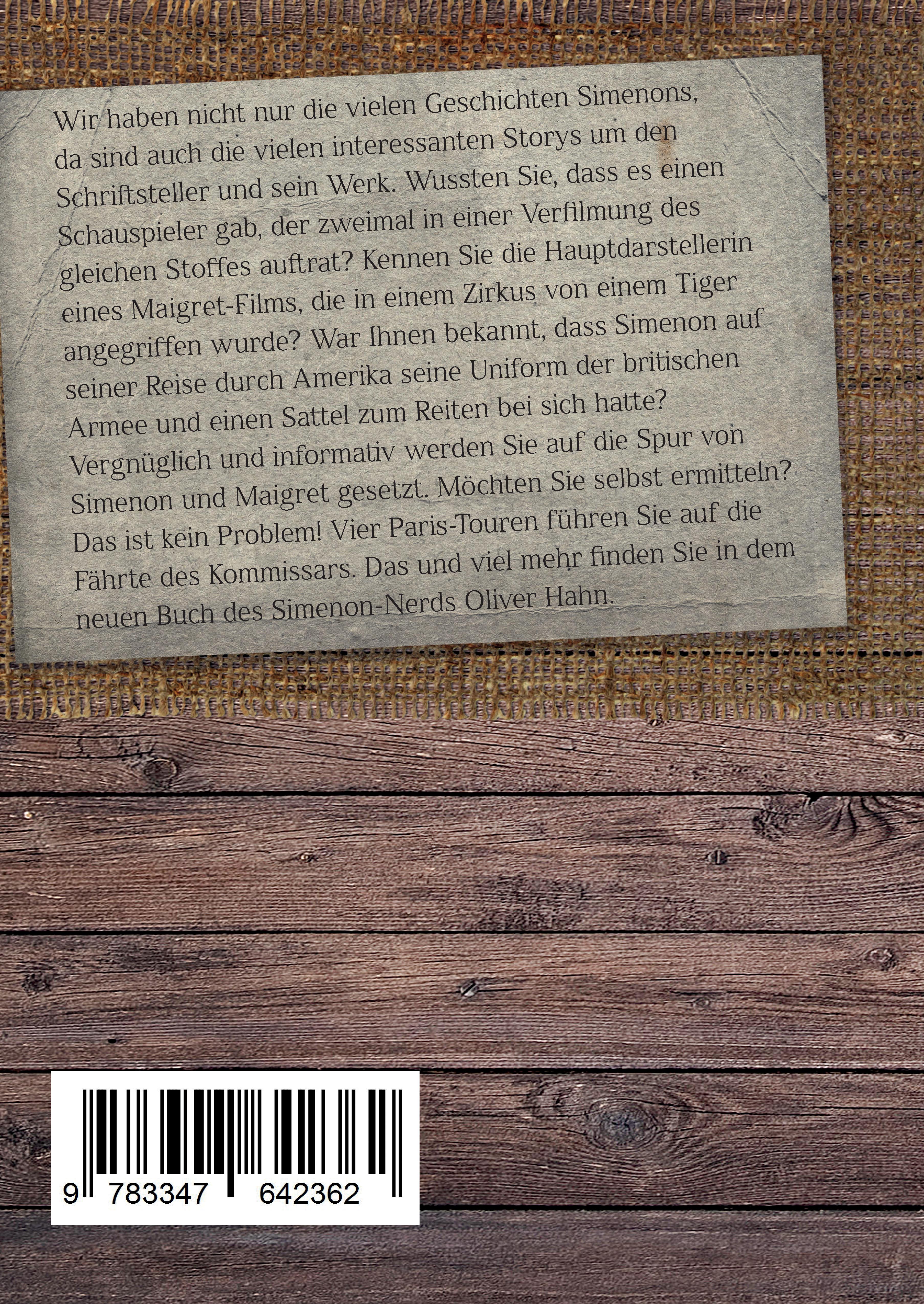 Wir haben nicht nur die vielen Geschichten Simenons, da sind auch die vielen interessanten Storys um den Schriftsteller und sein Werk. Wussten Sie, dass es einen Schauspieler gab, der zweimal in einer Verfilmung des gleichen Stoffes auftrat? Kennen Sie die Hauptdarstellerin eines Maigret-Films, die in einem Zirkus von einem Tiger angegriffen wurde? War Ihnen bekannt, dass Simenon auf seiner Reise durch Amerika seine Uniform der britischen Armee und einen Sattel zum Reiten bei sich hatte? Vergnüglich und informativ werden Sie auf die Spur von Simenon und Maigret gesetzt. Möchten Sie selbst ermitteln? Das ist kein Problem! Vier Paris-Touren führen Sie auf die Fährte des Kommissars. Das und viel mehr finden Sie in dem neuen Buch des Simenon-Nerds Oliver Hahn.Dieser Band über Simenon ist nicht nur ein Reisebegleiter für jeden Paris-Reisenden, der Interesse an Maigret hat. Die vier Routen werden Interessierte in die verschiedensten Ecken von Paris verschlagen - dabei immer auf der Spuren des berühmten Kommissars und unterstützt durch hilfreiche Karten. Die Reise führt diesmal durch drei Maigret-Romane - »Maigret amüsiert sich«, »Maigret und die junge Tote« und »Maigret und der Mann auf der Bank« - und darüber hinaus zu dem spannenden Non-Maigret-Roman »Sonntag«. Es ist ein Lesebuch für Simenon-Interessierte, die nie einen Zugang zu den »Intimen Memoiren« fanden, Gefallen an Verfilmungen haben und die gern nach links und rechts schauen, da, wo die eher abseitigen Themen zu finden sind.