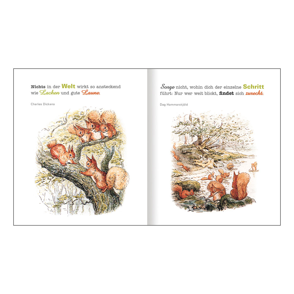 Mit Humor und Gelassenheit lebt es sich leichter! Das bringen beliebte Autoren in diesem Buch in Aphorismen und Lebensweisheiten auf den Punkt. Schließlich habe, so meinte Winston Churchill, noch niemand Bauchschmerzen von bösen Worten bekommen, die er ungesagt hinuntergeschluckt hat. Die kurzen Weisheiten werden hier herrlich nostalgisch von den Illustrationen der bekannten Kinderbuchautorin Beatrix Potter kommentiert. Das Eichhörnchen Nüssli stellt dabei allerhand Unsinn an und zaubert Ihnen garantiert ein Lächeln ins Gesicht. - Aphorismen und Lebensweisheiten zum Thema Humor und Gelassenheit- mit liebenswerten Eichhörnchen-Illustrationen von Beatrix Potter- für Jung und Alt ein schönes Geschenk