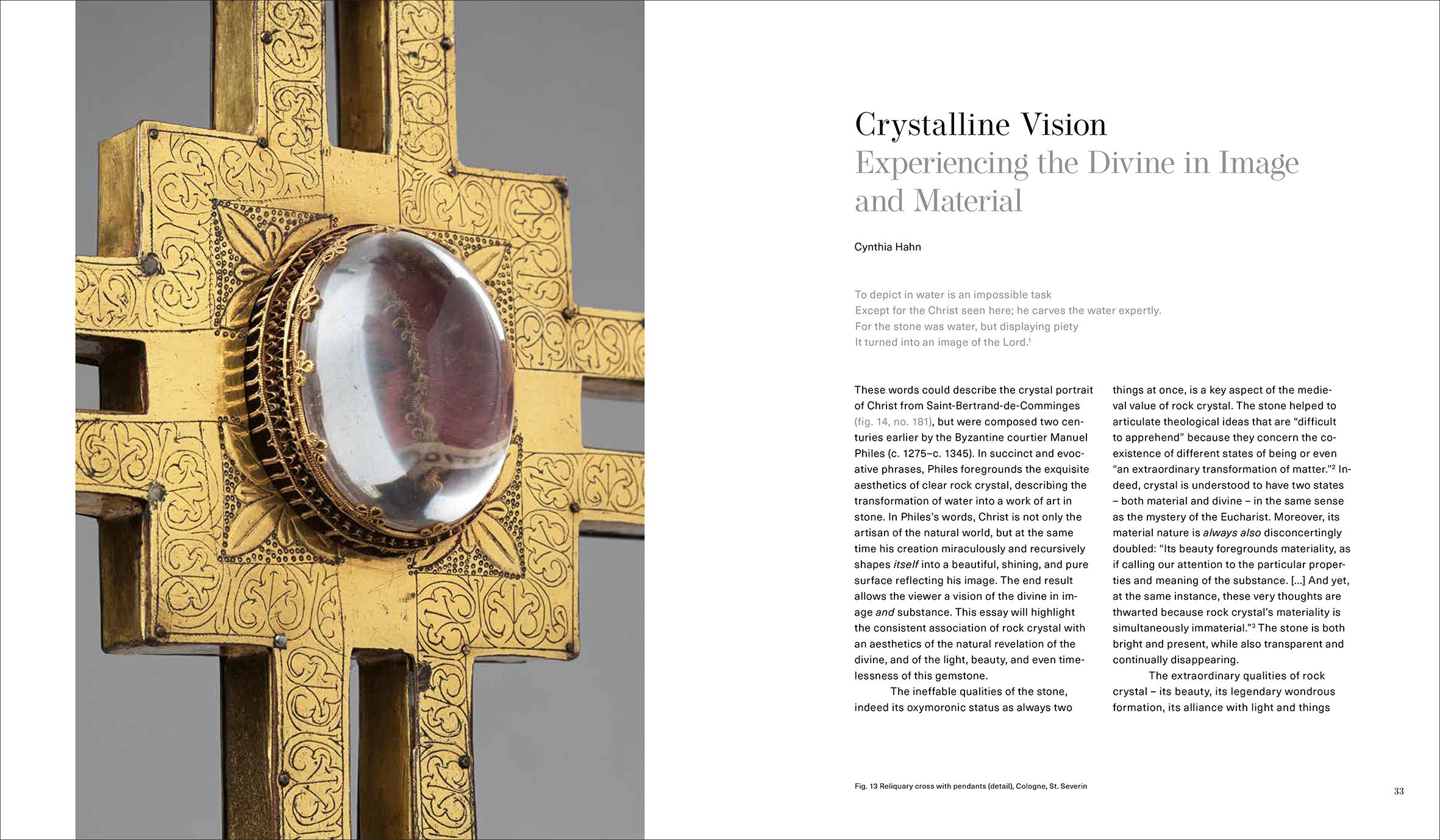 Lange nahm man an, es handele sich bei Bergkristall um zu ewigem Eis erstarrtes Wasser, und fertigte Objekte mit der Aura des Göttlichen daraus. Von der Antike bis zum ausgehenden Mittelalter reicht die Bandbreite der Werke von Gefäßen für Heiliges und Profanes über Kreuze, Schachspiele, Amulette, Kühlkugeln bis zu Amtszeichen und Lupen. Die Facetten des Materials Bergkristall, seine Bearbeitung, Verwendung und symbolische Ausdeutung werden aus der Perspektive von Kunst, Mineralogie, Archäologie, Philologie und Optik beleuchtet.