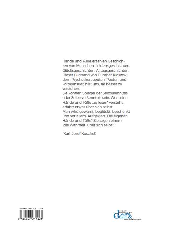Unsere Hände und Füße werden zu Zeugen, was wir erlebt haben in dieser Welt, wie wir unsere Hände und Füße benutzt haben, was wir „durchgemacht“ haben. Das Leben hinterlässt Spuren, insbesondere auf der Haut unseres Ge-sichtes, aber auch auf den Handrücken und den Fußsohlen, zeichnet sich ab in Falten, Schwielen und Flecken, macht unsere Leiden z. T. sichtbar: Denken wir an Füße, die Erfrierungen durchgemacht haben. Hingewiesen sei auf die Mudras (Sanskrit - Wort für „Siegel“, „Zeichen“) mit ih-ren symbolischen Bedeutungen im tantrischen Hinduismus und im Buddhis-mus, d. h. auf jene Fingerhaltungen, die Mystisches anklingen lassen.Bei der Zwiesprache mit und zwischen Händen und Füßen müssen Kindheit, Jugend und Alter in den Blick genommen werden, unser Alltag und die Feste, die wir feiern, Liebe und Leid, Leben und Tod. Mein Bestreben bezüglich der in diesem Buch gezeigten Bildern war es, so-wohl Foto - Aufnahmen zu verwenden, darüber hinaus aber auch – so denn na-heliegend oder geboten, Hände und Füße in eine neue Umgebung zu stellen, sie in ihrer Aussage zu verdichten bzw. zu erweitern durch Foto - Collage oder Foto - Montage.