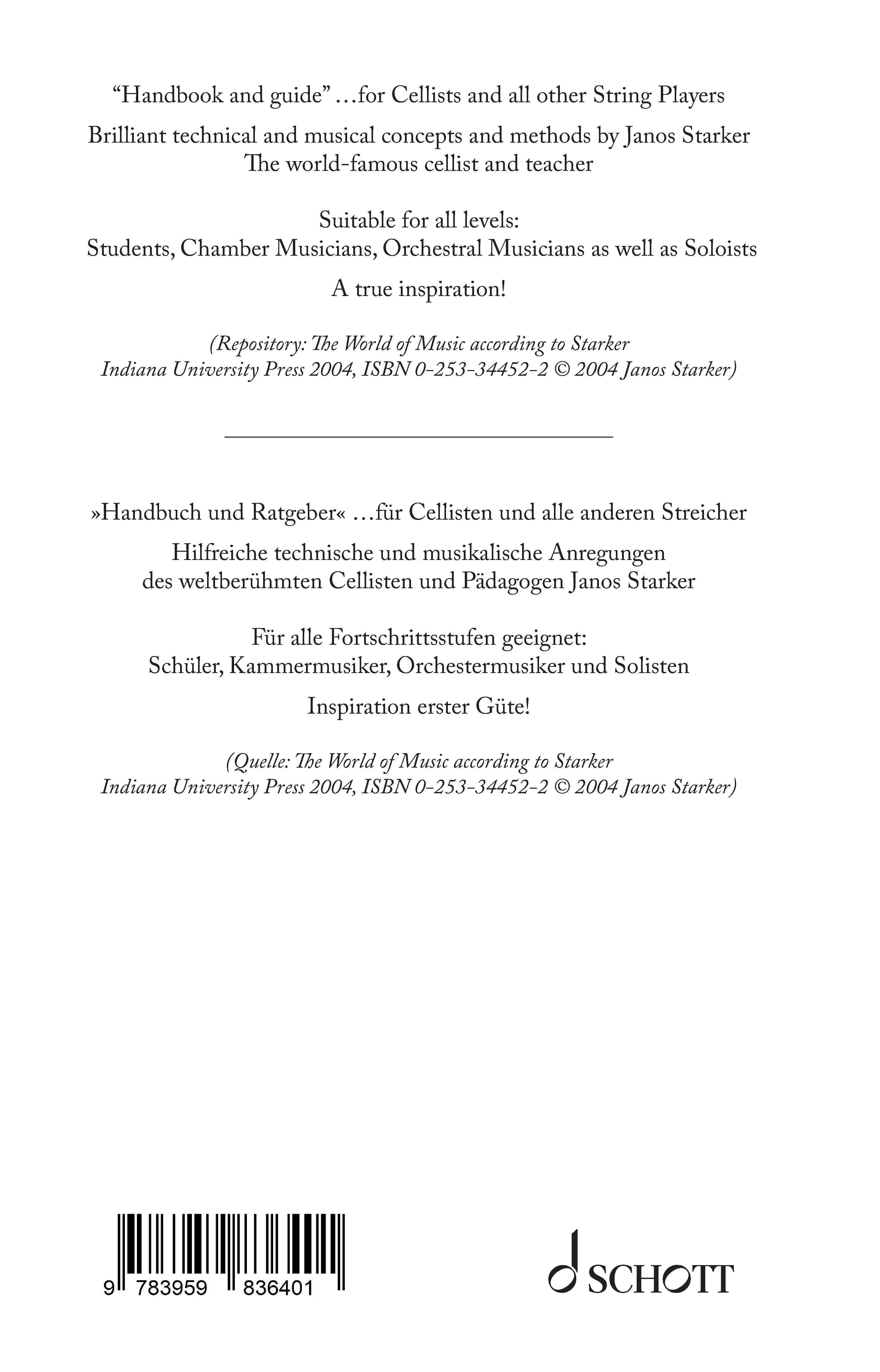 "Handbook and guide" ...for Cellists and all other String PlayersBrilliant technical and musical concepts and methods by Janos Starker, the world-famous cellist and teacherSuitable for all levels: Students, Chamber Musicians, Orchestral Musicians as well as SoloistsA true inspiration!(Repository: The World of Music according to Starker, Indiana University Press 2004, ISBN 0-253-34452-2, © 2004 Janos Starker)_________________________________»Handbuch und Ratgeber« ...für Cellisten und alle anderen StreicherHilfreiche technische und musikalische Anregungen des weltberühmten Cellisten und Pädagogen Janos StarkerFür alle Fortschrittsstufen geeignet: Schüler, Kammermusiker, Orchestermusiker und SolistenInspiration erster Güte!(Quelle: The World of Music according to Starker Indiana University Press 2004, ISBN 0-253-34452-2 © 2004 Janos Starker)
