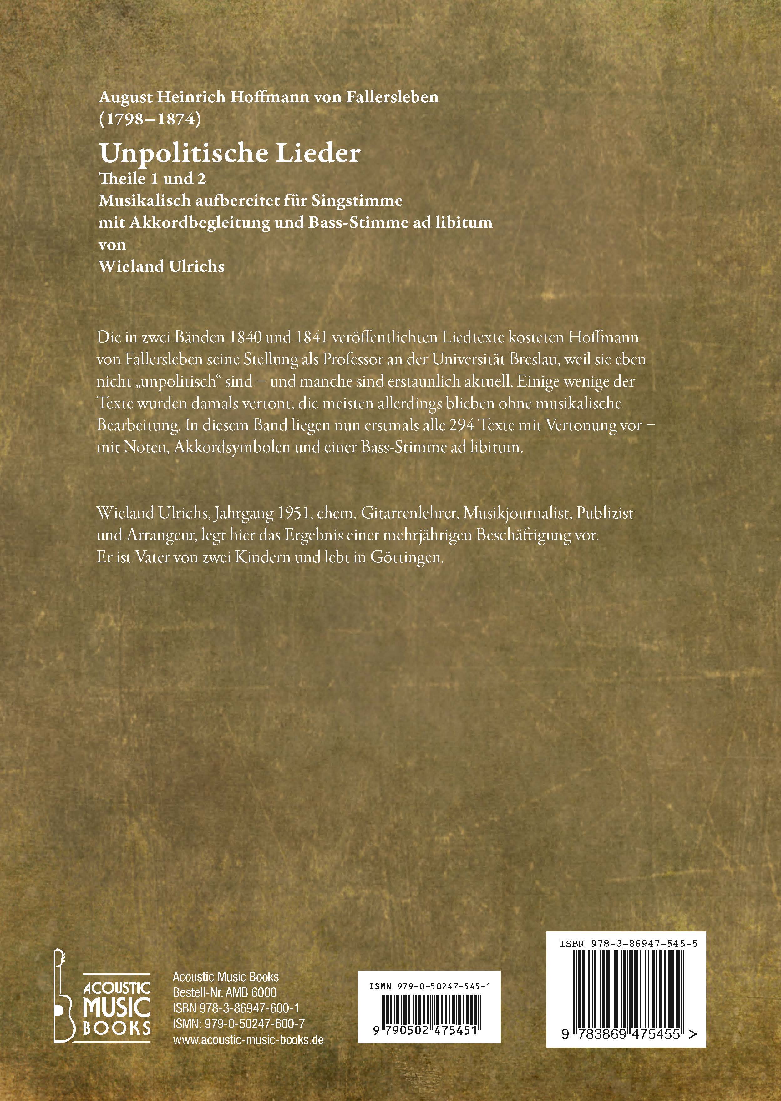 Die in zwei Bänden 1840 und 1841 veröffentlichten Liedtexte kosteten Hoffmann von Fallersleben seine Stellung als Professor an der Universität Breslau, weil sie eben nicht "unpolitisch" sind - und manche sind erstaunlich aktuell. Einige wenige der Texte wurden damals vertont, die meisten allerdings blieben ohne musikalische Bearbeitung. In diesem Band liegen nun erstmals alle 294 Texte mit Vertonung vor - mit Noten, Akkordsymbolen und einer Bass-Stimme ad libitum.
