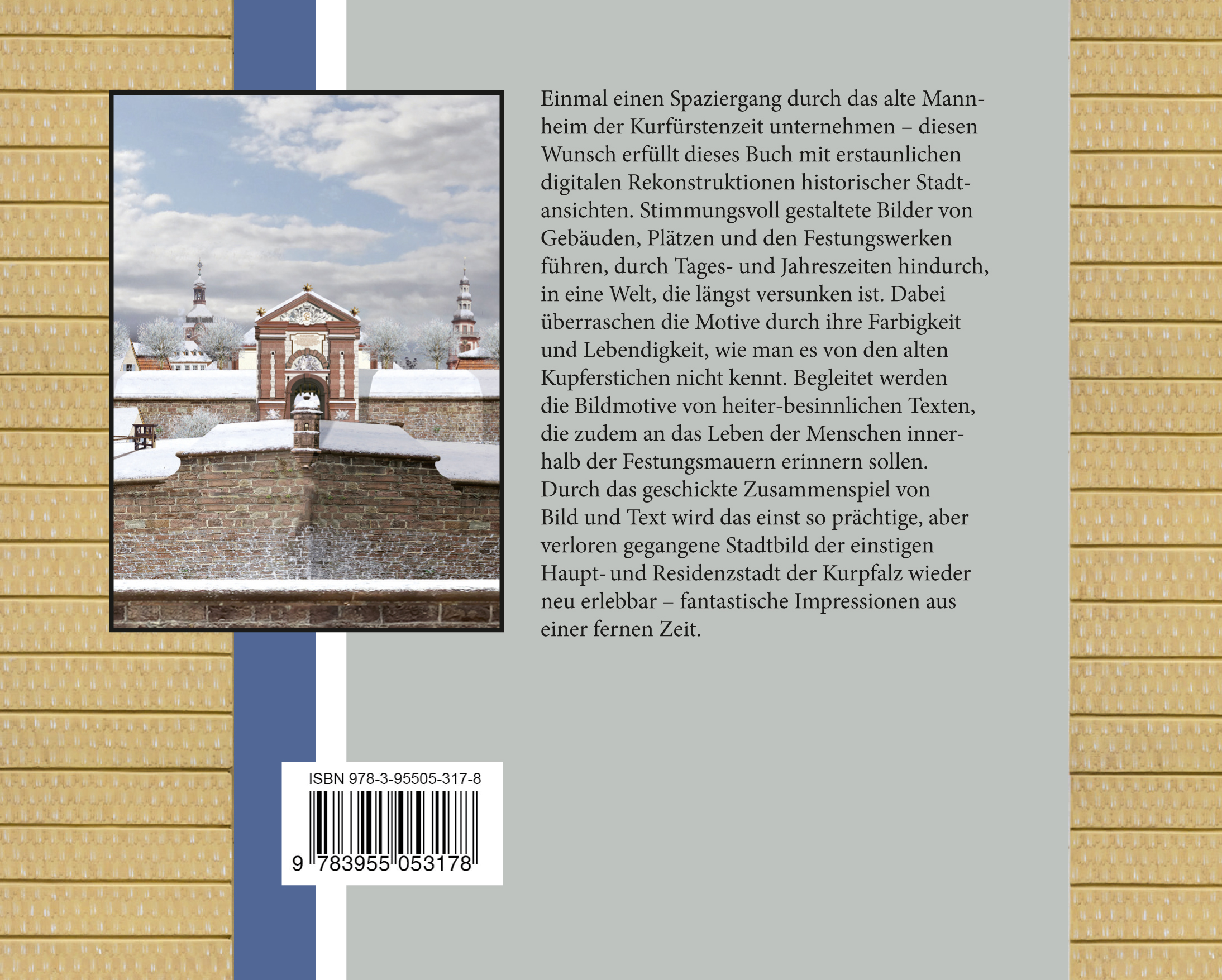 Einmal einen Spaziergang durch das alte Mannheim der Kurfürstenzeit unternehmen - diesen Wunsch erfüllt dieses Buch mit erstaunlichen digitalen Rekonstruktionen historischer Stadtansichten.Stimmungsvoll gestaltete Bilder von Gebäuden, Plätzen und den Festungswerken führen, durch Tages- und Jahreszeiten hindurch, in eine Welt, die längst versunken ist. Dabei überraschen die Motive durch ihre Farbigkeit und Lebendigkeit, wie man es von den alten Kupferstichen nicht kennt. Begleitet werden die Bildmotive von heiter-besinnlichen Texten, die zudem an das Leben der Menschen innerhalb der Festungsmauern erinnern sollen. Durch das geschickte Zusammenspiel von Bild und Text wird das einst so prächtige, aber verloren gegangene Stadtbild der einstigen Haupt- und Residenzstadt der Kurpfalz wieder neu erlebbar - fantastische Impressionen aus einer fernen Zeit.