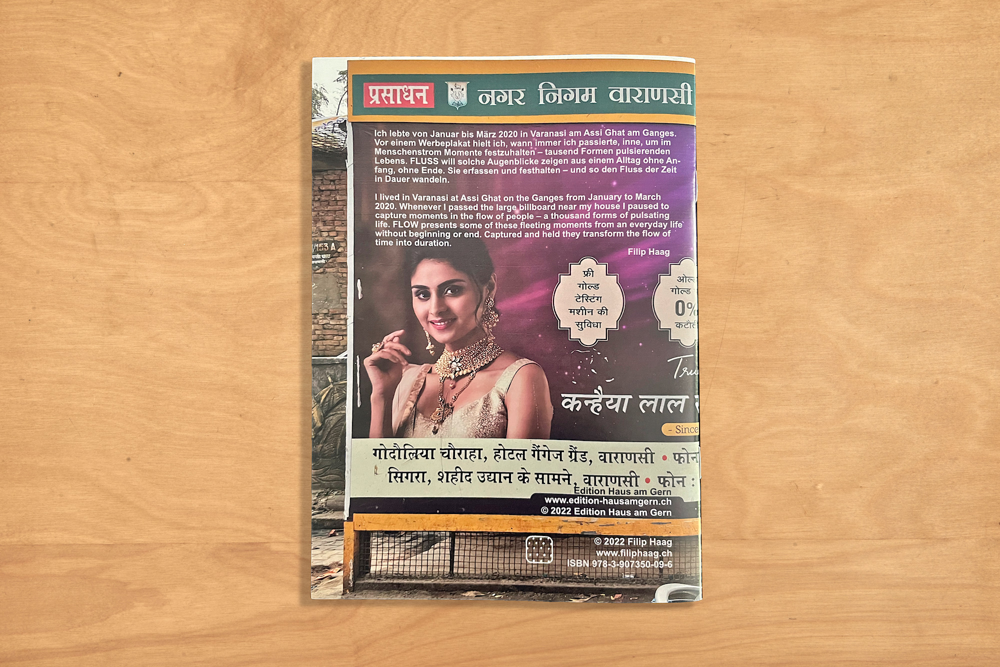 FLOW The image on the book cover depicts an advertisement for a jewellery store. Behind the advertisement is a newly built latrine - yet you have to know this, because it is not visible. A man who evidently is very poor, anxiously looks back over his shoulder while approaching the latrine. He is barefoot, the clothes he wears are too big for him, and neither his hair nor beard have received a cut for quite a while. He might not have a home, might not enjoy the luxury of living in a house. Does he look over his shoulder because he is not sure whether he is allowed to use the latrine? Who may, and who not use this facility? Alone again, our beauty continues to smile on the picture. Motorcyclists hurriedly rush by. The women in the foreground are going somewhere else, away from our beauty. Are they looking for a place to relieve themselves, where they cannot be seen? The beauty in the advertisement covers a latrine that can be used only by men. But where do women go to pee? Maybe they go to the shore of the holy river Ganges nearby, taking turns in holding up sheets to allow each other some privacy? The older man in the third image is on his way to another place, too. He might be going to mother Ganges, the holy river, too. Where does he come from? Is he here to immerse the ashes of a deceased relative in the Ganga's waters, granting salvation from the eternal circle of birth, rebirth, and death? For this is the main reason thousands of pilgrims come to Varanasi each day, to the holy city at the river Ganga's shores. Varanasi is also called the ,great cremation ground': dying here ensures immediate salvation. It might also be that the older gentleman is on his way to the morning yoga sessions at Assi Ghat, to get his blood flowing and to meet his old friends? Soon a 'Pani Puri' cart stops in front of the latrine, somehow framing it. This delicious snack is sold everywhere, though some foreign tongues might find it too hot. Whether Riksha driver, book vendor, traveler, or pilgrim - a plate of Pani Puri is inexpensive and keeps you alert. Even though some Pani Puri connoisseurs might be disturbed by the smell of the latrine, which is getting more intense by the hour. Lost in thoughts, a girl passes by our beauty on the advertisement. She's wrapped in a woolen shawl, as it is still pretty cold in the mornings. No, she's not on her way to school, for then she would wear a neatly ironed uniform, and her mother would have braided her hair tightly, shining with coconut oil. Where are you going, being so different from the beauty on the poster? Are you going to work? Are you some upper-class household's cleaning maid? Or are you on your way to one of.... (read in the publication) Ute Hüsken