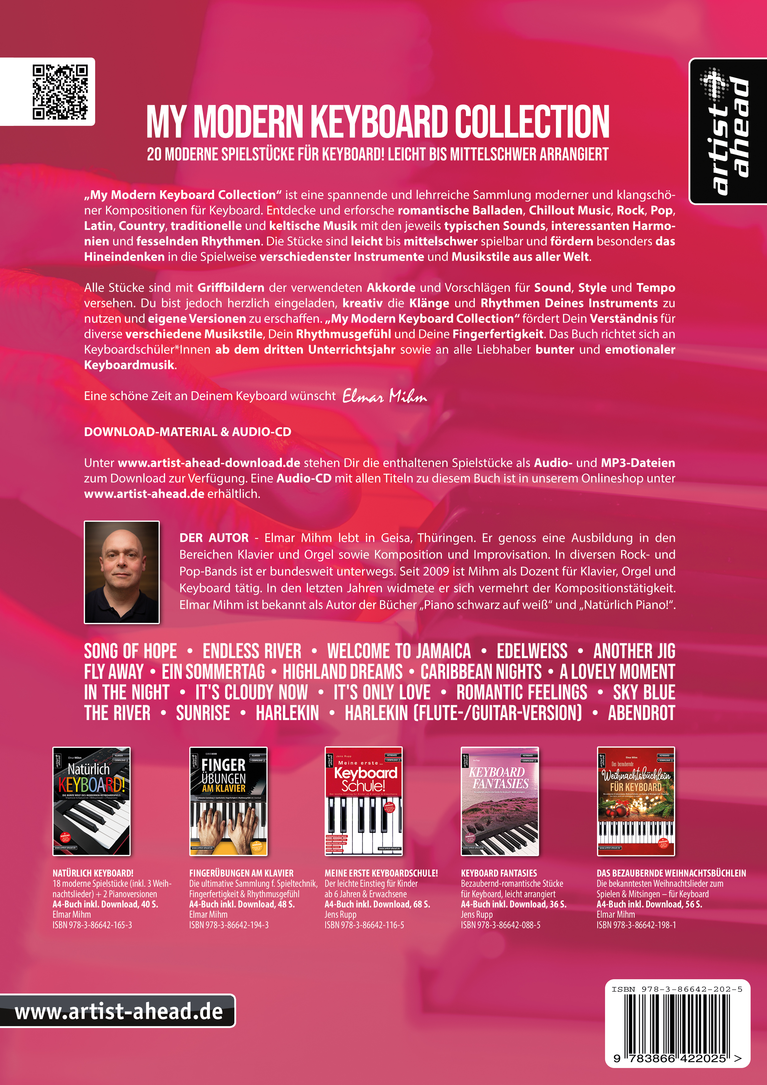 "My Modern Keyboard Collection" ist eine spannende und lehrreiche Sammlung moderner und klangschöner Kompositionen für Keyboard. Entdecke und erforsche romantische Balladen, Chillout Music, Rock, Pop, Latin, Country, traditionelle und keltische Musik mit den jeweils typischen Sounds, interessanten Harmonien und fesselnden Rhythmen. Die Stücke sind leicht bis mittelschwer spielbar und fördern besonders das Hineindenken in die Spielweise verschiedenster Instrumente und Musikstile aus aller Welt.