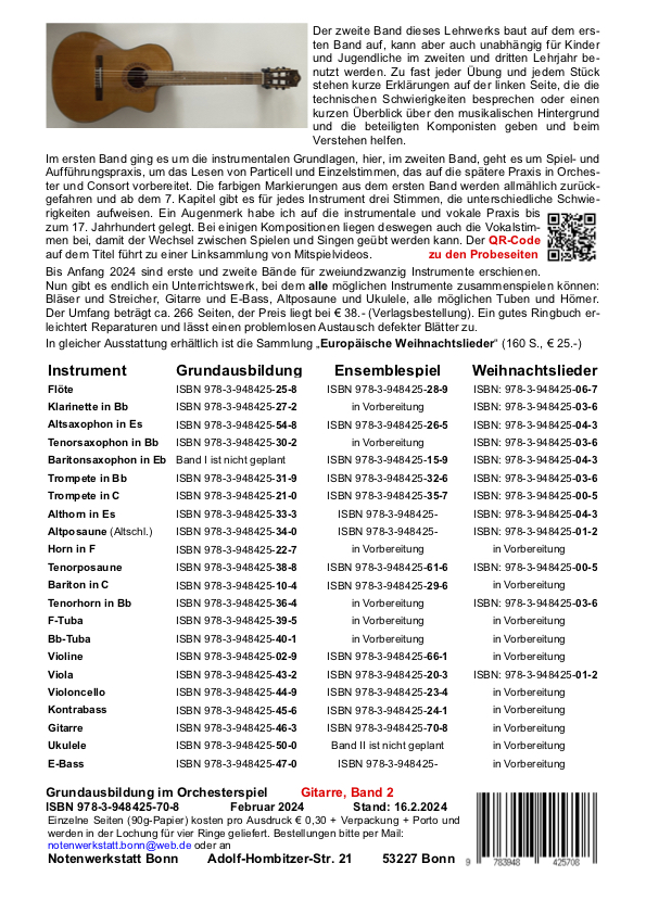 Die farbigen Markierungen aus dem ersten Band werden allmählich zurückgefahren und ab dem 7. Kapitel gibt es für jedes instrument drei Stimmen, die unterschiedliche Schwierigkeiten aufweisen. Ein Augenmerk habe ich auf die instrumentale und vokale Praxis bis zum 17. Jahrhundert gelegt. Bei einigen Kompositionen liegen deswegen auch die Vokalstimmen bei, damit der Wechsel zwischen Spielen und Singen geübt werden kann. Der QR-Code auf dem Titel führt zu einer Mitspielsammlung, bei der man das Stück zum youtube-Video mit-spielen kann.