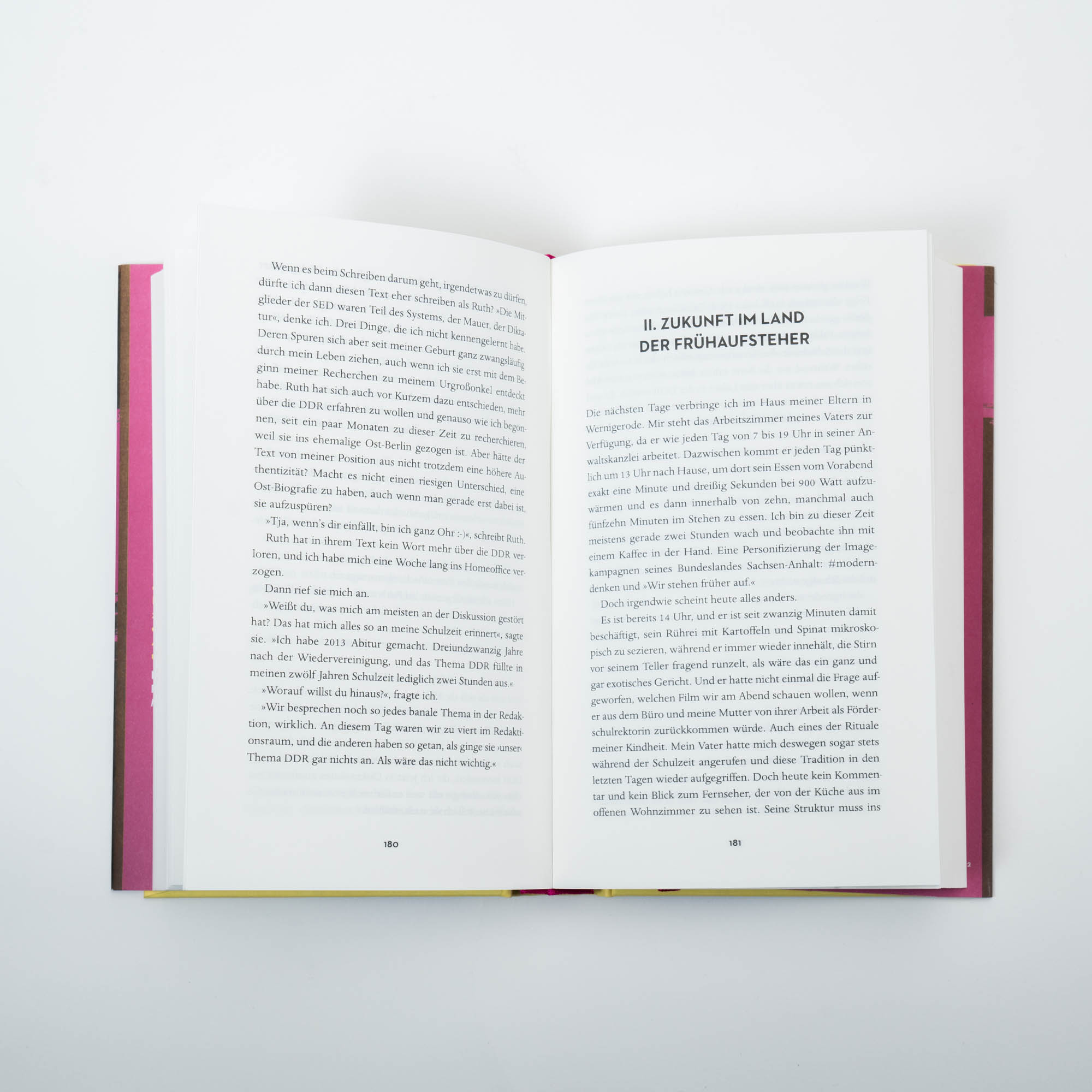 »Es gibt viele Bücher Nachgeborener über die DDR, viele Bücher über die Suche nach diesem untergegangenen Land und der Frage danach, was das mit der eigenen Biografie zu tun hat. Aron Boks gelingt, was Viele nur vortäuschen: Er hat ernsthaftes Interesse. Emphatisch, kritisch, feinfühlig legt er die Ambivalenzen offen, die sich ergeben, wenn man sich mit "der DDR" beschäftigt. Chapeau!« — Lukas Rietzschel, Autor des Bestsellers Raumfahrer