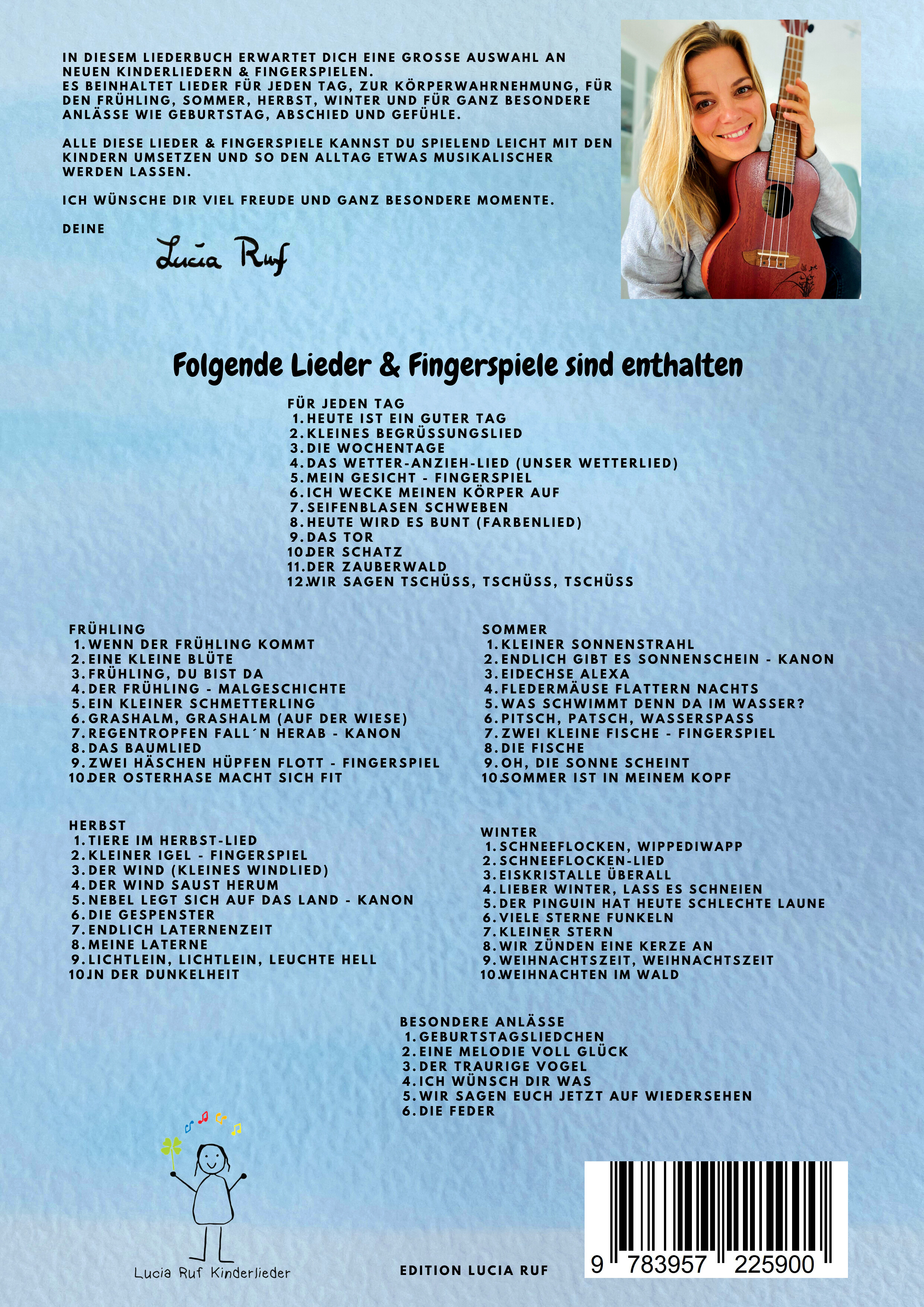 Musikalisch durch den Morgenkreis in Krippe & Kita - Mit einer großen Auswahl an neuen Kinderliedern, Fingerspielen & Ideen für einen musikalischen Alltag mit Kindern.Das Liederbuch mit dem pädagogischen PLUS und allen Texten, Noten und Gitarrengriffen zum Mitsingen und Mitspielen.58 bezaubernde neue Kinderlieder & Fingerspiele von und mit Lucia Ruf & Freund*innen.In diesem Liederbuch erwartet dich eine große Auswahl an neuen Kinderliedern, Fingerspielen & Ideen für einen musikalischen Alltag mit Kindern.Es beinhaltet Lieder für jeden Tag, zur Begrüßung, für zwischendurch, zur Körperwahrnehmung, für den Frühling, Sommer, Herbst & Winter und für ganz besondere Anlässe wie Geburtstag, Abschied und Gefühle.Die Inhalte sind nach Themen sortiert und vor jedem neuen Kapitel findest du eine genaue Inhaltsangabe mit Beschreibung der Lieder bzw. Fingerspiele.Auf geht's! Schnapp dir die Musikinstrumente und schon kann es losgehen.Inhaltsverzeichnis:Für jeden Tag:Heute ist ein guter TagKleines BegrüßungsliedDie WochentageDas Wetter-Anzieh-Lied (Unser Wetterlied)Mein Gesicht - FingerspielIch wecke meinen Körper aufSeifenblasen schwebenHeute wird es bunt (Farbenlied)Das TorDer SchatzDer ZauberwaldWir sagen tschüss, tschüss, tschüssFrühling:Wenn der Frühling kommtEine kleine BlüteFrühling, du bist daDer Frühling - MalgeschichteEin kleiner SchmetterlingGrashalm, Grashalm (Auf der Wiese)Regentropfen fall'n herab - KanonDas BaumliedZwei Häschen hüpfen flott - FingerspielDer Osterhase macht sich fitSommer:Kleiner SonnenstrahlEndlich gibt es Sonnenschein - KanonEidechse AlexaFledermäuse flattern nachtsWas schwimmt denn da im Wasser?Pitsch, patsch, WasserspaßZwei kleine Fische - FingerspielDie FischeOh, die Sonne scheintSommer ist in meinem KopfHerbst:Tiere im Herbst-LiedKleiner Igel - FingerspielDer Wind (Kleines Windlied)Der Wind saust herumNebel legt sich auf das Land - KanonDie GespensterEndlich LaternenzeitMeine LaterneLichtlein, Lichtlein, leuchte hellIn der DunkelheitWinter:Schneeflocken, wippediwappSchneeflocken-LiedEiskristalle überallLieber Winter, lass es schneienDer Pinguin hat heute schlechte LauneViele Sterne funkelnKleiner SternWir zünden eine Kerze anWeihnachtszeit, WeihnachtszeitWeihnachten im WaldBesondere Anlässe:GeburtstagsliedchenEine Melodie voll GlückDer traurige VogelIch wünsch dir wasWir sagen euch jetzt auf WiedersehenDie FederViel Freude beim Singen, Tanzen und Musizieren.
