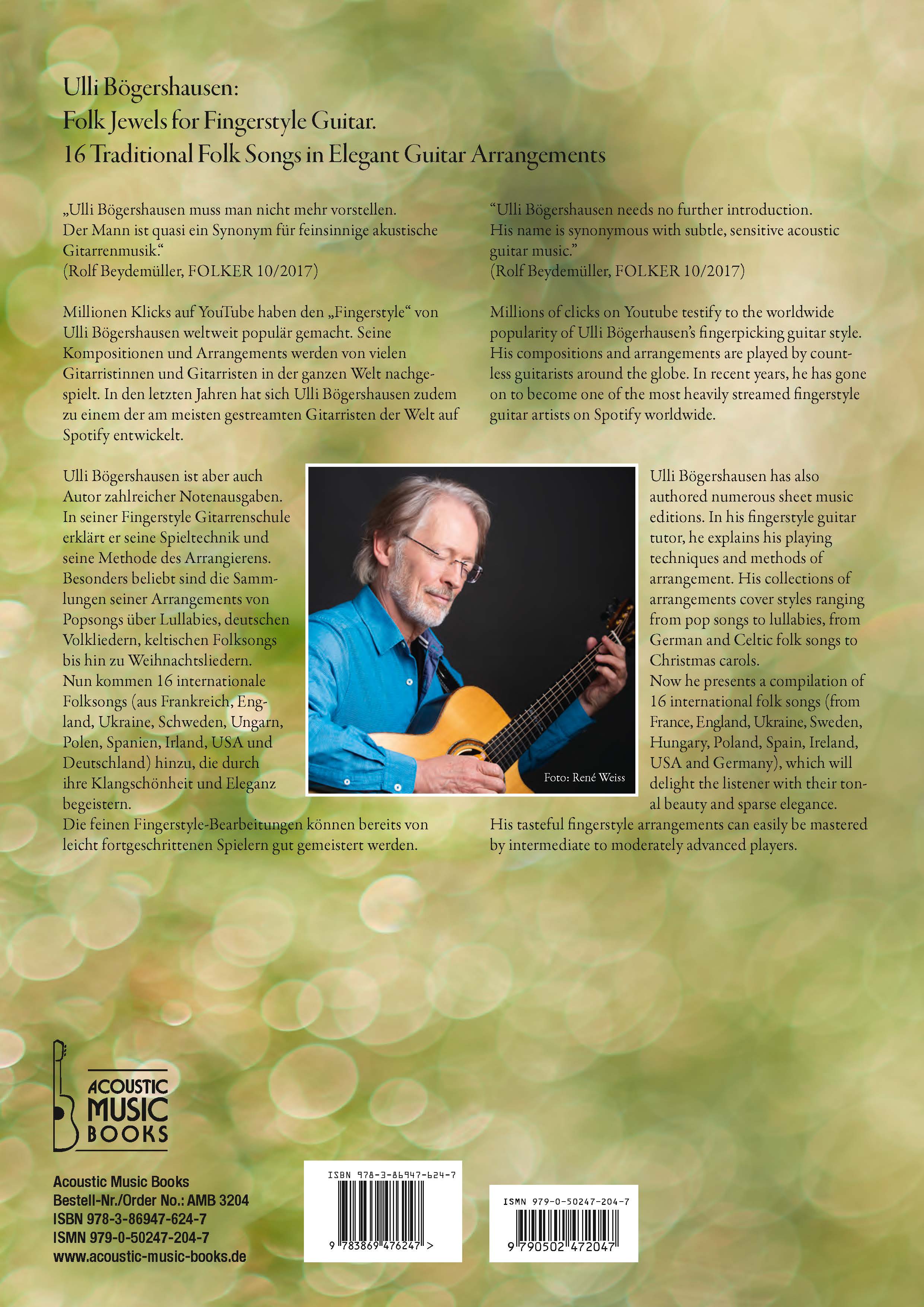 Millionen Klicks auf YouTube haben den „Fingerstyle“ von Ulli Bögershausen weltweit populär gemacht. Seine Kompositionen und Arrangements werden von vielen Gitarristinnen und Gitarristen in der ganzen Welt nachgespielt. In den letzten Jahren hat sich Ulli Bögershausen zudem zu einem der am meisten gestreamten Gitarristen der Welt auf Spotify entwickelt. Ulli Bögershausen ist aber auch Autor zahlreicher Notenausgaben. In seiner Fingerstyle Gitarrenschule erklärt er seine Spieltechnik und seine Methode des Arrangierens. Besonders beliebt sind die Sammlungen seiner Arrangements von Popsongs über Lullabies, deutschen Volkliedern, keltischen Folksongs bis hin zu Weihnachtsliedern. Nun kommen 16 internationale Folksongs (aus Frankreich, Eng- land, Ukraine, Schweden, Ungarn, Polen, Spanien, Irland, USA und Deutschland) hinzu, die durch ihre Klangschönheit und Eleganz begeistern. Die feinen Fingerstyle-Bearbeitungen können bereits von leicht fortgeschrittenen Spielern gut gemeistert werden.
