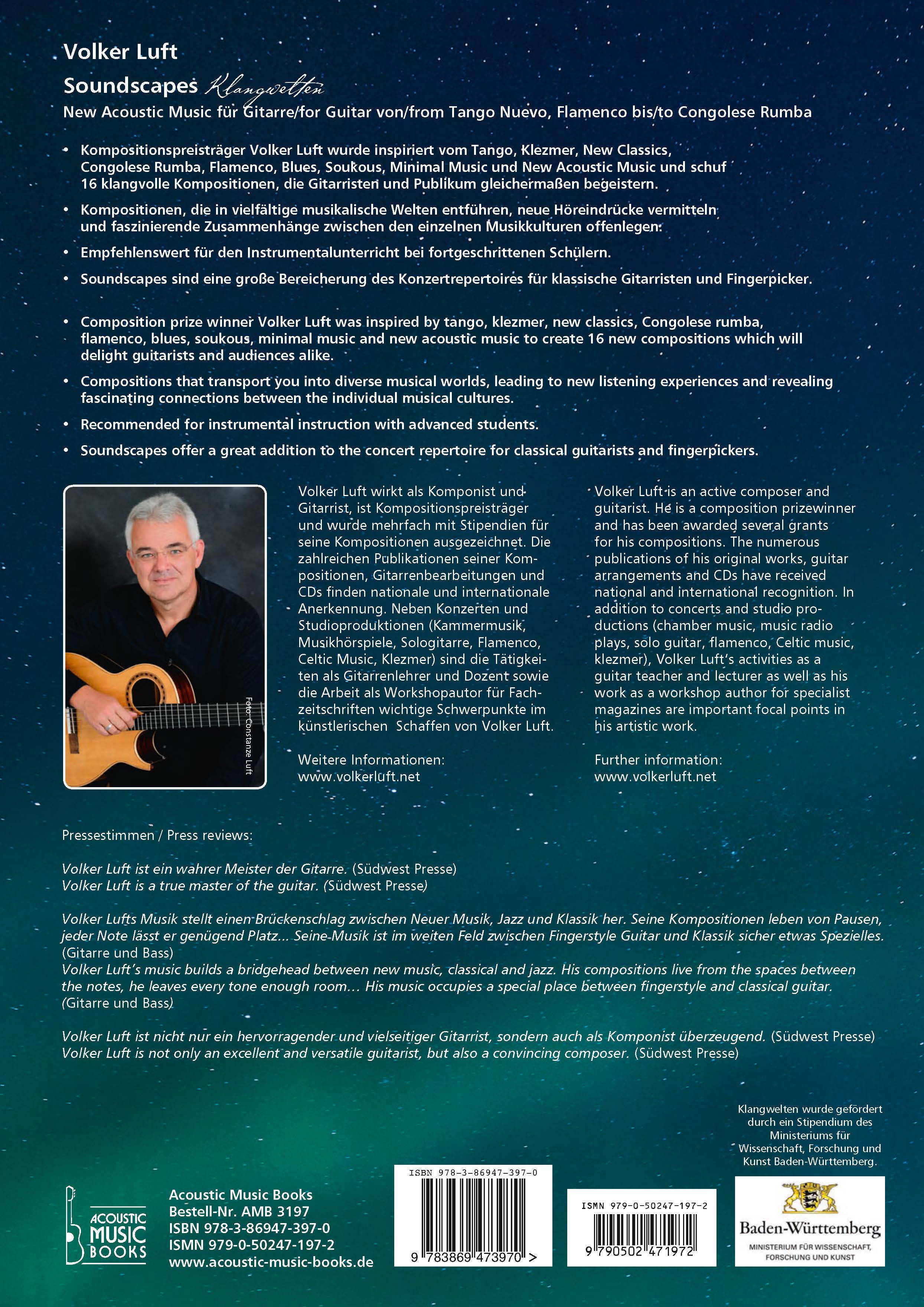 -Kompositionspreisträger Volker Luft wurde inspiriert vom Tango, Klezmer, New Classics,Congolese Rumba, Flamenco, Blues, Soukous, Minimal Music und New Acoustic Music und schuf16 klangvolle Kompositionen, die Gitarristen und Publikum gleichermaßen begeistern.-Kompositionen, die in vielfältige musikalische Welten entführen, neue Höreindrücke vermittelnund faszinierende Zusammenhänge zwischen den einzelnen Musikkulturen offenlegen.-Empfehlenswert für den Instrumentalunterricht bei fortgeschrittenen Schülern.-Soundscapes sind eine große Bereicherung des Konzertrepertoires für klassische Gitarristen und Fingerpicker.