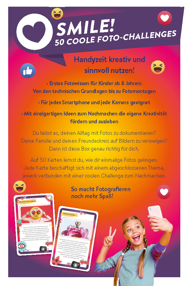 Auf 50 Karten lernst du, wie dir einmalige Fotos gelingen. Dafür brauchst du weder eine teure Foto-Ausrüstung noch das neueste Smartphone. Du erfährst, wie du scharfe Bilder mit der richtigen Bildaufteilung machst, wie welches Licht wirkt, wie du Filter anwendest und deinen eigenen Stil findest. Jede Karte beschäftigt sich mit einem abgeschlossenen Thema, jeweils verbunden mit einer coolen Challenge zum Nachmachen.