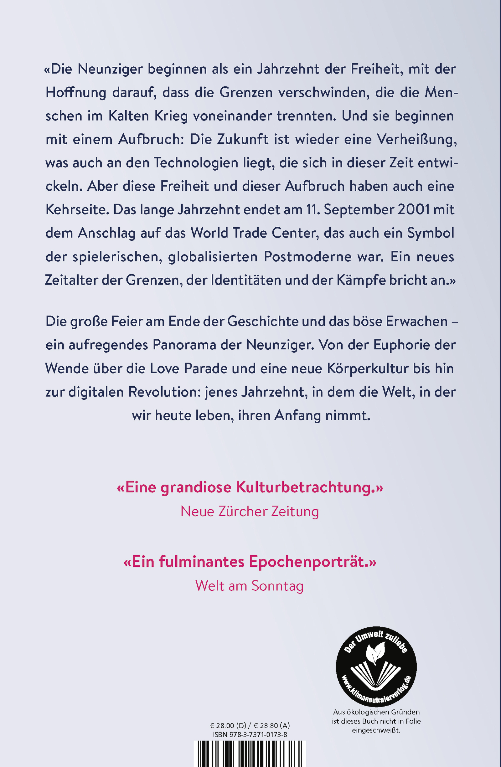Aber unter der heiteren Oberfläche brechen alte Konflikte auf, Gespenster aus der Vergangenheit kehren zurück. Im Osten Deutschlands, aber nicht nur dort, entsteht eine rechte Jugendkultur bislang ungekannten Ausmaßes. Im zerfallenden Jugoslawien geschieht das Unfassbare: der erste Krieg in Europa seit 1945. Der politische Islam wird zur globalen Bedrohung, und das lange Jahrzehnt endet am 11. September 2001 mit dem Anschlag auf das World Trade Center, das auch ein Symbol der spielerischen, globalisierten Postmoderne gewesen ist.