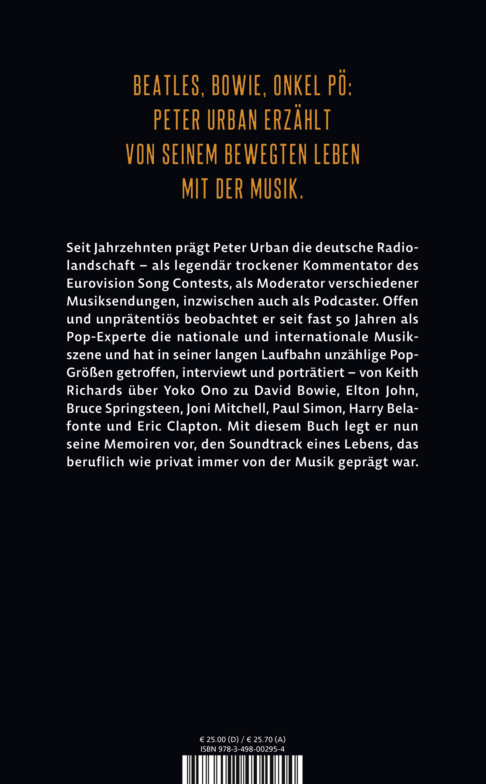 Seit Jahrzehnten prägt Peter Urban die deutsche Radiolandschaft - als legendär trockener Kommentator des Eurovision Song Contests, als Moderator verschiedener Musiksendungen, inzwischen auch als Podcaster. Offen und unprätentiös beobachtet er seit fast 50 Jahren als Popexperte die nationale und internationalen Musikszene und hat in seiner langen Laufbahn unzählige Popgrößen getroffen, interviewt und porträtiert - von Keith Richards, über Yoko Ono zu David Bowie, Elton John, Joni Mitchell, Harry Belafonte und Eric Clapton. Mit diesem Buch legt er nun seine Memoiren vor, den Soundtrack eines Lebens, das beruflich wie privat immer von der Musik geprägt war.
