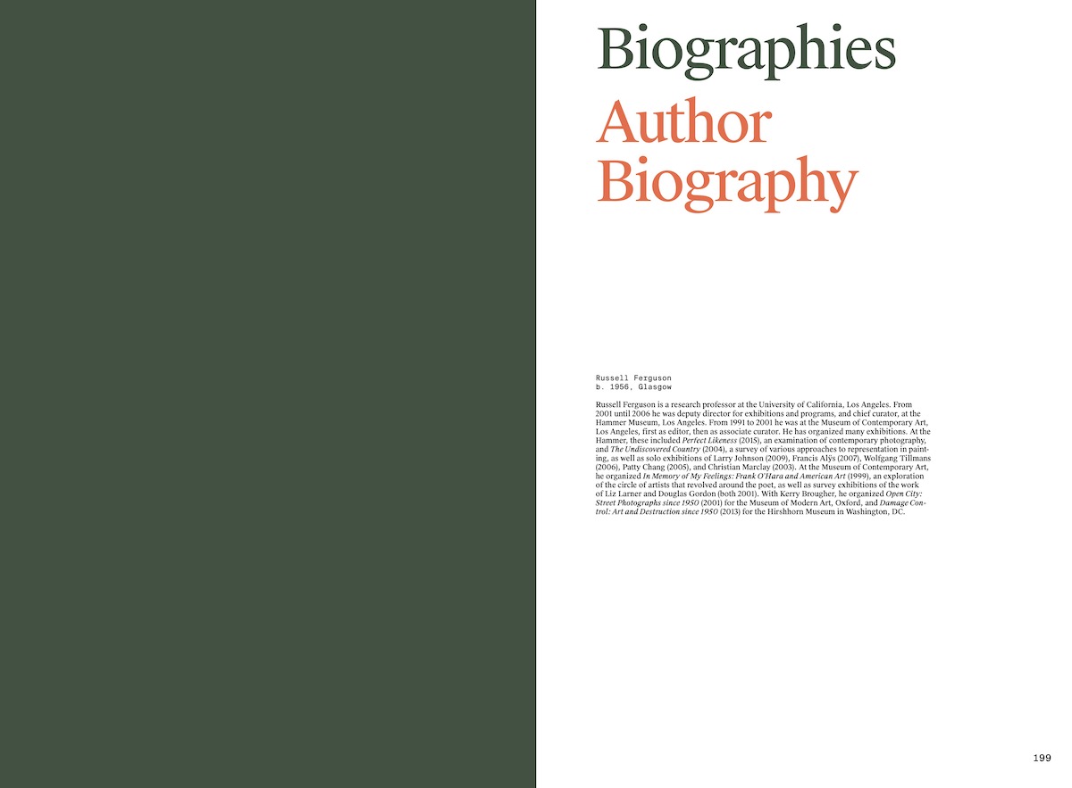 RUSSELL FERGUSON is a research professor at the University of California's Art Department. During his tenure at the Museum of Contemporary Art and the Hammer Museum in Los Angeles, he curated numerous exhibitions on culture and representation in contemporary art and photography.