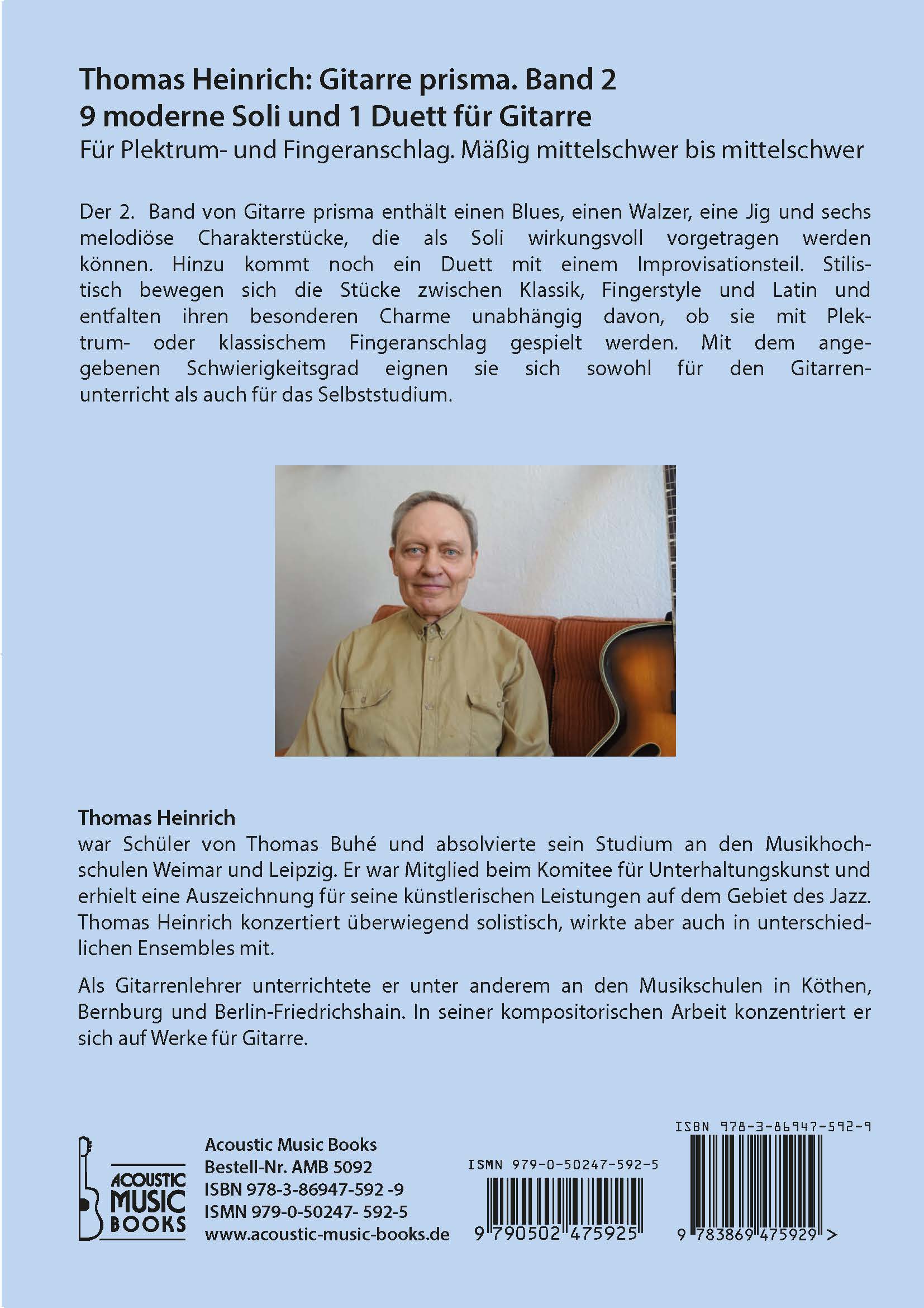 Der 2. Band von Gitarre prisma enthält einen Blues, einen Walzer, eine Jig und sechs melodiöse Charakterstücke, die als Soli wirkungsvoll vorgetragen werden können. Hinzu kommt noch ein Duett mit einem Improvisationsteil. Stilis-tisch bewegen sich die Stücke zwischen Klassik, Fingerstyle und Latin und entfalten ihren besonderen Charme unabhängig davon, ob sie mit Plek-trum- oder klassischem Fingeranschlag gespielt werden. Mit dem ange-gebenen Schwierigkeitsgrad eignen sie sich sowohl für den Gitarren-unterricht als auch für das Selbststudium.