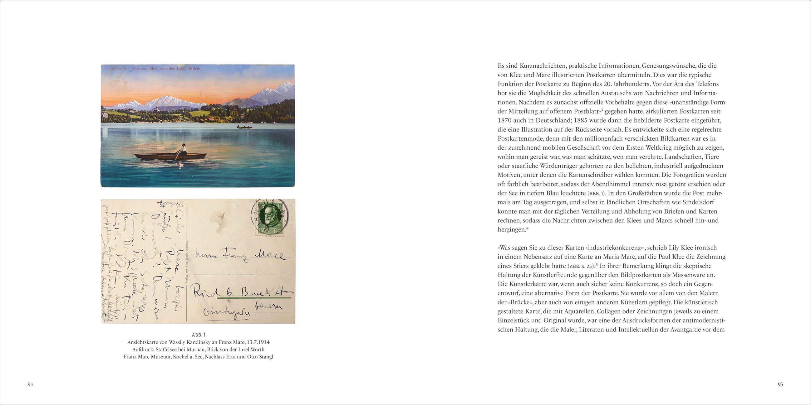 In der illustrierten Korrespondenz kommentieren die originellen Bilder die scheinbar alltäglichen, teils banalen Mitteillungen auf den Postkarten augenzwinkernd und verknüpfen sie mit den kleineren und größeren Ereignissen im Leben der Freunde. Die bibliophile Publikation der Karten in Text und Bild offenbart neben der persönlichen Verbundenheit auch die unterschiedlichen künstlerischen Positionen der beiden. So treten die bewusst ungelenken, sperrigen Zeichnungen Klees in einen inspirierenden Dialog mit der Harmonie und Perfektion von Marcs kleinen »Gemälden«.