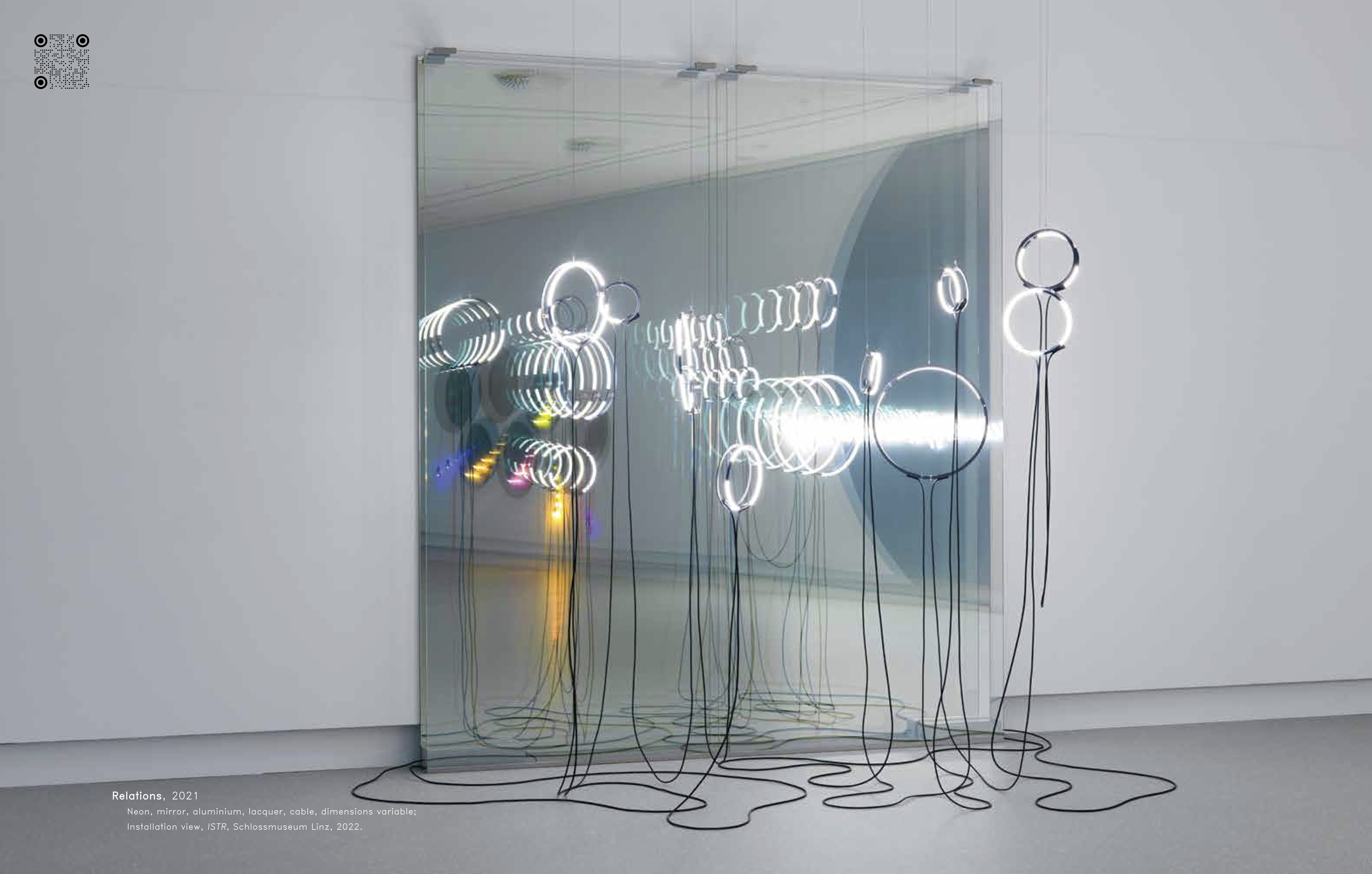 Licht und Raum, Medien und Information sind zentrale Aspekte der vielschichtigen konzeptuellen Arbeit von Brigitte Kowanz (geb. 1957 in Wien, gest. 2022 ebenda). Die Künstlerin wurde 2009 mit dem Großen Osterreichischen Staatspreis ausgezeichnet und bespielte 2017 den Osterreichischen Pavillon auf der 57. Biennale von Venedig. Von 1997 bis 2021 hatte sie eine Professur an der Universitat für Angewandte Kunst in Wien inne. Bis kurz vor ihrem Tod arbeitete Kowanz intensiv an der Installation ISTR, die ihren Entwürfen entsprechend im Schlossmuseum Linz posthum realisiert wurde. Die vier Saulen im ersten Raum geben den Auftakt aus Neon, Spiegeln und Glas; jede ist mit einem der vier Buchstaben des Titels in Morsecode versehen: I S T R - I SEEM TO RECALL (Ich scheine mich zu erinnern) ladt dazu ein, Kowanz' künstlerischen Kosmos zu betreten. In ihrem uvre verbindet sich Sprachliches - politische Aussagen und Nachrichtenübertragungen - mit formaler Asthetik, was veranschaulicht, dass Licht nicht bloß ein neutrales Vehikel für Information ist, sondern diese entscheidend mitgestaltet.