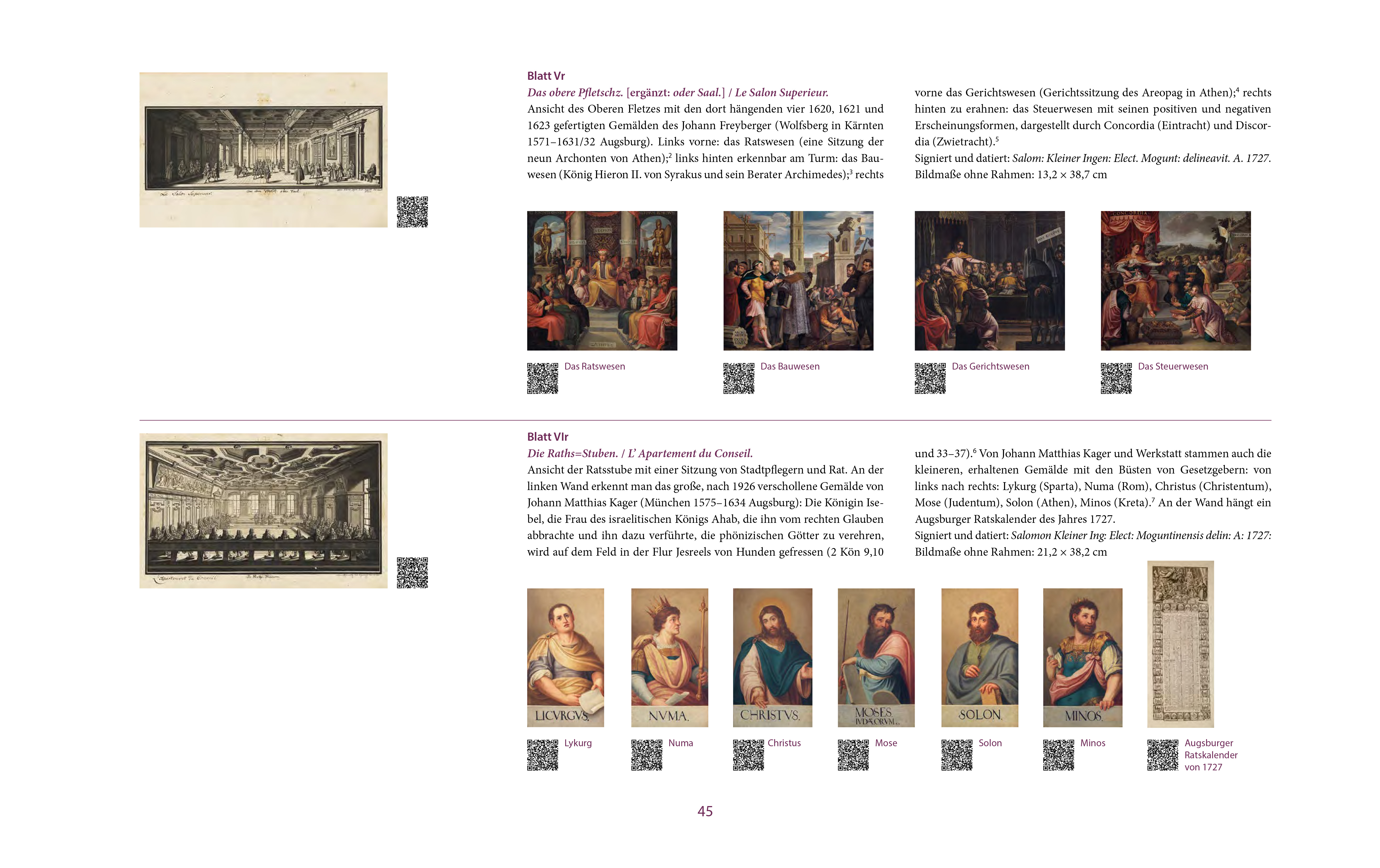 Im Jahr 1732 erschien bei Jeremias Wolffs Erben in Augsburg Das prächtige Rath Hauß der Stadt Augspurg, eine Kupferstichedition mit Ansichten, Grund- und Aufrissen des 1615 von Elias Holl (1573-1646) begonnenen und bis 1625/26 reich ausgestatteten berühmten Augsburger Rathauses und seiner prächtigen Innenräume. Von der Forschung kaum beachtet, verwahrt die Staats- und Stadtbibliothek Augsburg die originalen Zeichnungen Kleiners zu dieser Edition und stellt sie hier erstmals in Originalgröße und -farbe vor, auf den gegenüberliegenden Blättern jeweils die gleiche Ansicht aus dem Druck von 1732. Im einführenden und erläuternden Text werden die Originale erklärt, die Blicke in die Innenräume dezidiert mit ihrer bedeutenden Ausstattung beschrieben und die bis heute erhaltenen Gemälde in Farbabbildungen präsentiert. Die historische Dokumentation der 'guten Stube' Augsburgs neu entdeckt - eine kleine Sensation, auch außerhalb Augsburgs!
