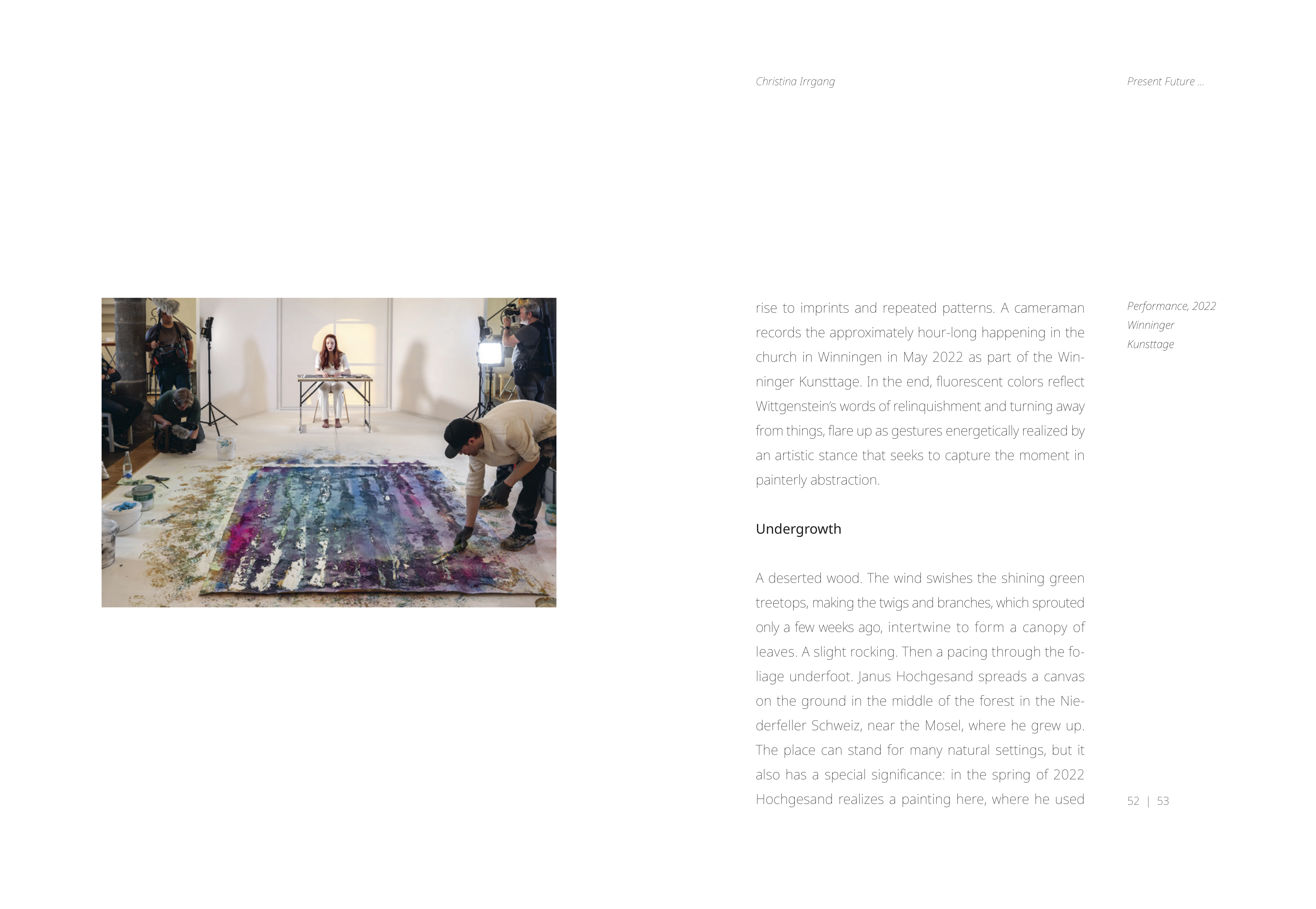 With a foreword by Rene Spiegelberger, a text by Christina Irrgang, and extensive documentation of five performances, the book project Live Paintings invites readers to discover the characteristic artistic process of the artist, whose abstract color-intensive paintings are created in front of an audience and outside the studio. Musicians and actors accompany Janus Hochgesand; they experience the moment of creation and influence the work through their presence. His movements across the canvas spread out on the floor become a dance, the colors materialized sounds.